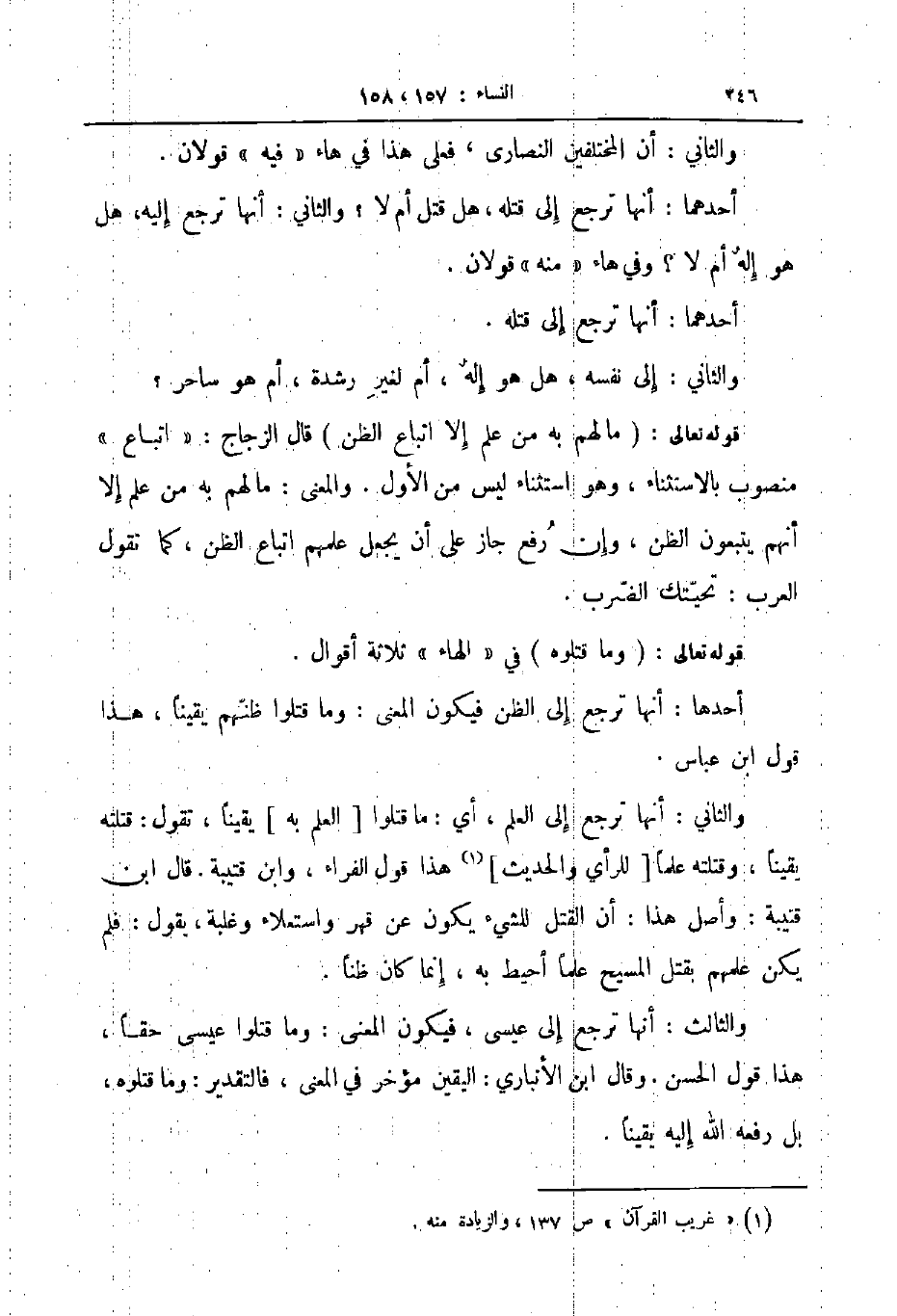 والثاني أنها ترجع إلى العلم أي ما قتلوا العلم به يقينا تقول قتلته يقينا وقتلته علما للرأي والحديث هذا قول الفراء وابن قتيبة قال ابن قتيبة وأصل هذا أن القتل للشيء يكون عن قهر واستعلاء وغلبة يقول فلم يكن علمهم بقتل المسيح علما أحيط به إنما كان ظنا