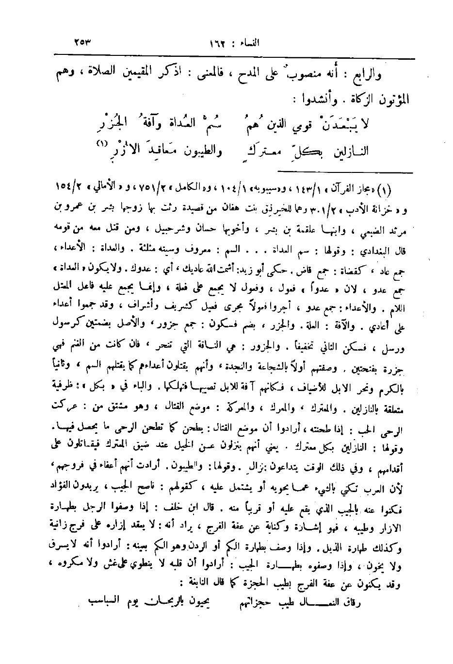 والرابع أنه منصوب على المدح فالمعنى اذكر المقيمين الصلاة وهم المؤتون الزكاة وأنشدوا ... لا يبعدن قومي الذين هم ... سم العداة وآفة الجزر ... النازلين بكل معترك ... والطيبون معاقد الأزر