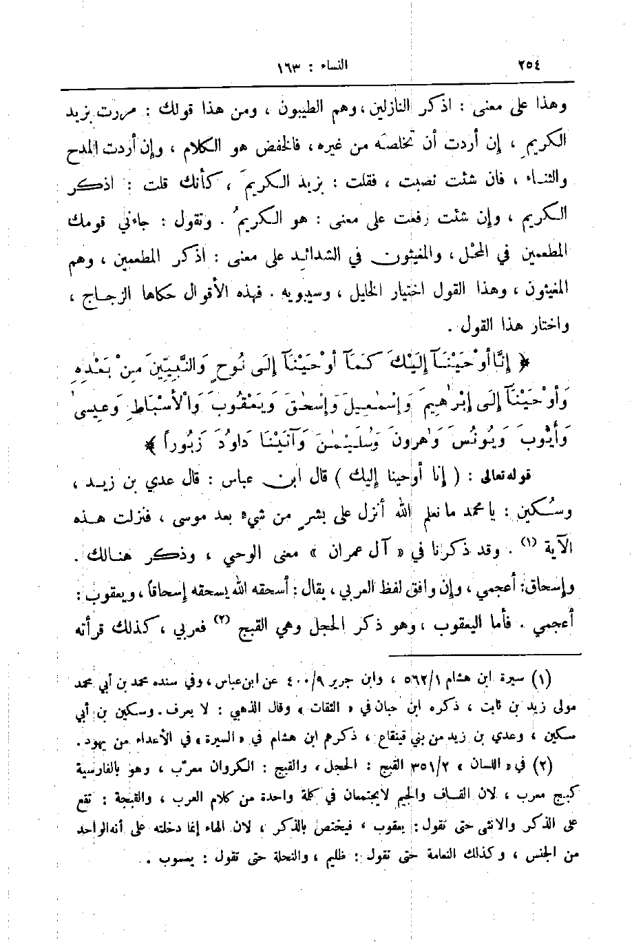 وهذا على معنى اذكر النازلين وهم الطيبون ومن هذا قولك مررت بزيد الكريم إن أردت أن تخلصه من غيره فالخفض هو الكلام وإن أردت المدح والثناء فان شئت نصبت فقلت بزيد الكريم كأنك قلت اذكر الكريم وإن شئت رفعت على معنى هو الكريم وتقول جاءني قومك المطعمين في المحل والمغيثون في الشدائد على معنى اذكر المطعمين وهم المغيثون وهذا القول اختيار الخليل وسيبويه فهذه الأقوال حكاها الزجاج واختار هذا القول إنا أوحينا إليك كمآ أوحينآ إلى نوح والنبيين من بعده وأوحينا إلى إبراهيم وإسمعيل وإسحق ويعقوب والأسباط وعيسى وأيوب ويونس وهرون وسليمن وآتينا داود زبورا