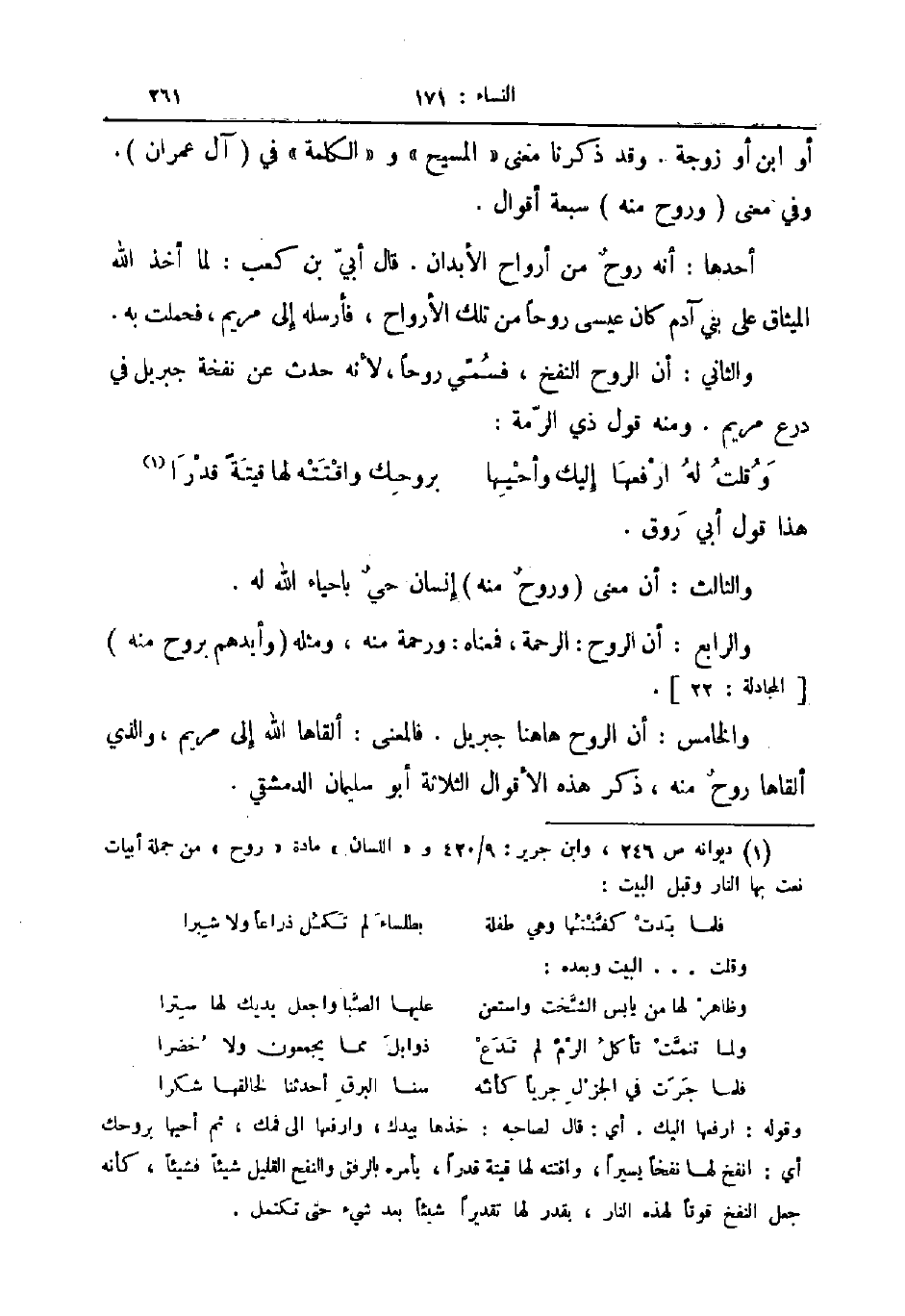 والخامس أن الروح هاهنا جبريل فالمعنى ألقاها الله إلى مريم والذي ألقاها روح منه ذكر هذه الأقوال الثلاثة أبو سليمان الدمشقي