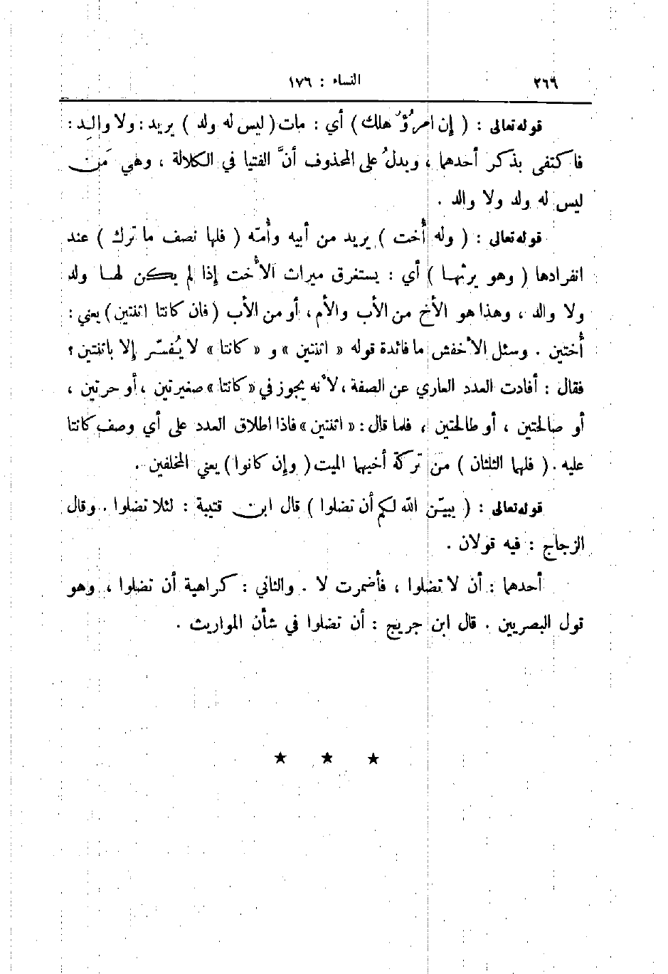 قوله تعالى وله أخت يريد من أبيه وأمه فلها نصف ما ترك عند انفرادها وهو يرثها أي يستغرق ميراث الأخت إذا لم يكن لها ولد ولا والد وهذا هو الأخ من الأب والأم أو من الأب فان كانتا اثنتين يعني أختين وسئل الأخفش ما فائدة قوله اثنتين و كانتا لا يفسر إلا باثنتين فقال أفادت العدد العاري عن الصفة لأنه يجوز في كانتا صغيرتين أو حرتين أو صالحتين أو طالحتين فلما قال اثنتين فاذا اطلاق العدد على أي وصف كانتا عليه فلهما الثلثان من تركة أخيهما الميت وإن كانوا يعني المخلفين