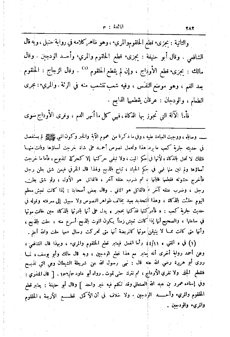 والثانية يجزئ قطع الحلقوم والمريء وهو ظاهر كلامه في رواية حنبل وبه قال الشافعي وقال أبو حنيفة يجزئ قطع الحلقوم والمريء وأحد الودجين وقال مالك يجزئ قطع الأوداج وإن لم يقطع الحلقوم وقال الزجاج الحلقوم بعد الفم وهو موضع النفس وفيه شعب تتشعب منه في الرئة والمريء مجرى الطعام والودجان عرقان يقطعهما الذابح
