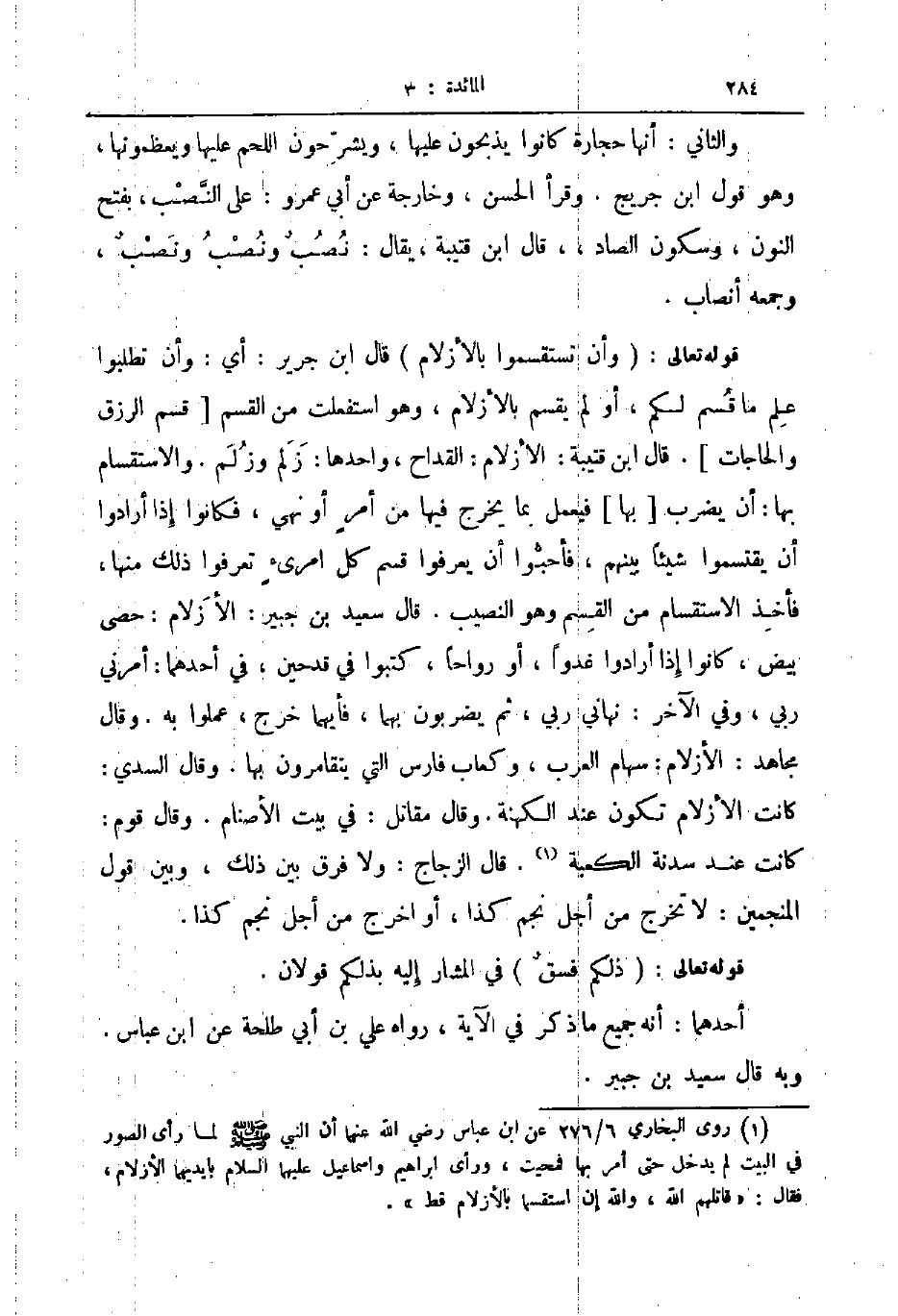 قوله تعالى وأن تستقسموا بالأزلام قال ابن جرير أي وأن تطلبوا علم ما قسم لكم أو لم يقسم بالأزلام وهو استفعلت من القسم قسم الرزق والحاجات قال ابن قتيبة الأزلام القداح واحدها زلم وزلم والاستقسام بها أن يضرب بها فيعمل بما يخرج فيها من أمر أو نهي فكانوا إذا أرادوا أن يقتسموا شيئا بينهم فأحبوا أن يعرفوا قسم كل امرئ تعرفوا ذلك منها فأخذ الاستقسام من القسم وهو النصيب قال سعيد بن جبير الأزلام حصى بيض كانوا إذا أرادوا غدوا أو رواحا كتبوا في قدحين في أحدهما أمرني ربي وفي الآخر نهاني ربي ثم يضربون بهما فأيهما خرج عملوا به وقال مجاهد الأزلام سهام العرب وكعاب فارس التي يتقامرون بها وقال السدي كانت الأزلام تكون عند الكهنة وقال مقاتل في بيت الأصنام وقال قوم كانت عند سدنة الكعبة قال الزجاج ولا فرق بين ذلك وبين قول المنجمين لا تخرج من أجل نجم كذا أو اخرج من أجل نجم كذا