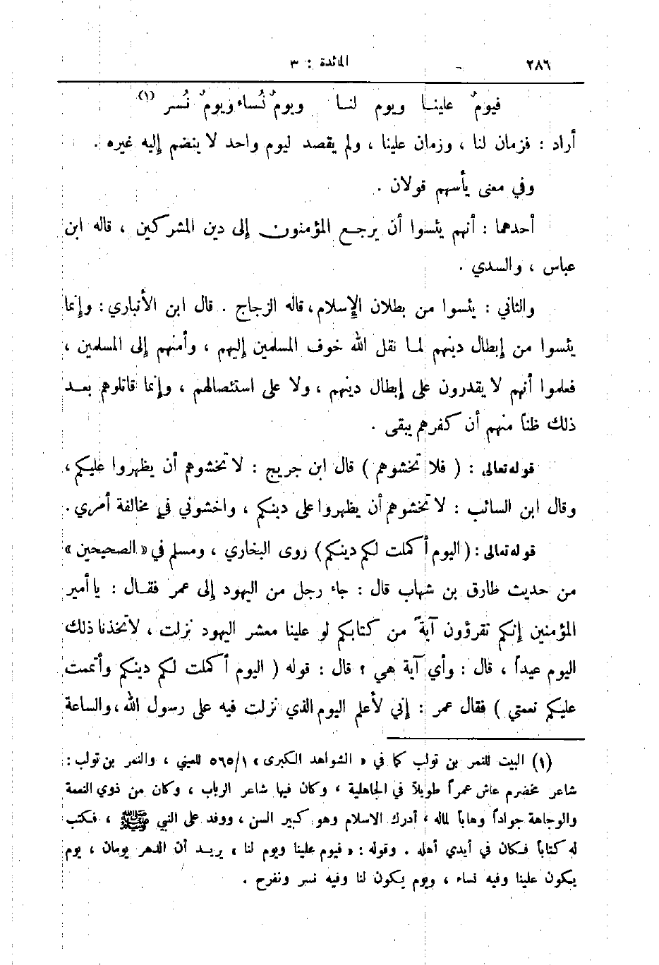 قوله تعالى اليوم أكملت لكم دينكم روى البخاري ومسلم في الصحيحين من حديث طارق بن شهاب قال جاء رجل من اليهود إلى عمر فقال يا أمير المؤمنين إنكم تقرؤون آية من كتابكم لو علينا معشر اليهود نزلت لاتخذنا ذلك اليوم عيدا قال وأي آية هي قال قوله اليوم أكملت لكم دينكم وأتممت عليكم نعمتي فقال عمر إني لأعلم اليوم الذي نزلت فيه على رسول الله والساعة