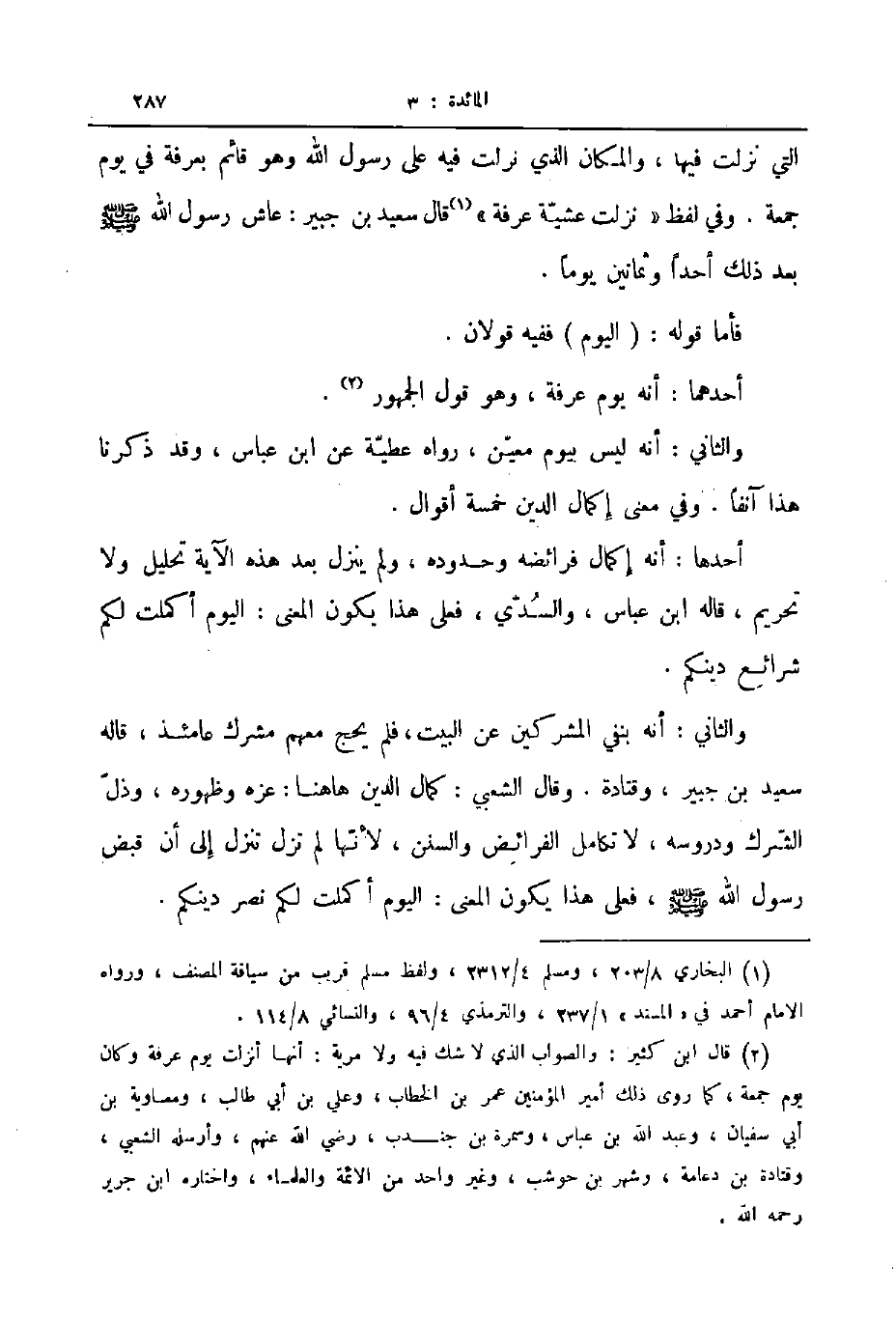 والثاني أنه ليس بيوم معين رواه عطية عن ابن عباس وقد ذكرنا هذا آنفا وفي معنى إكمال الدين خمسة أقوال