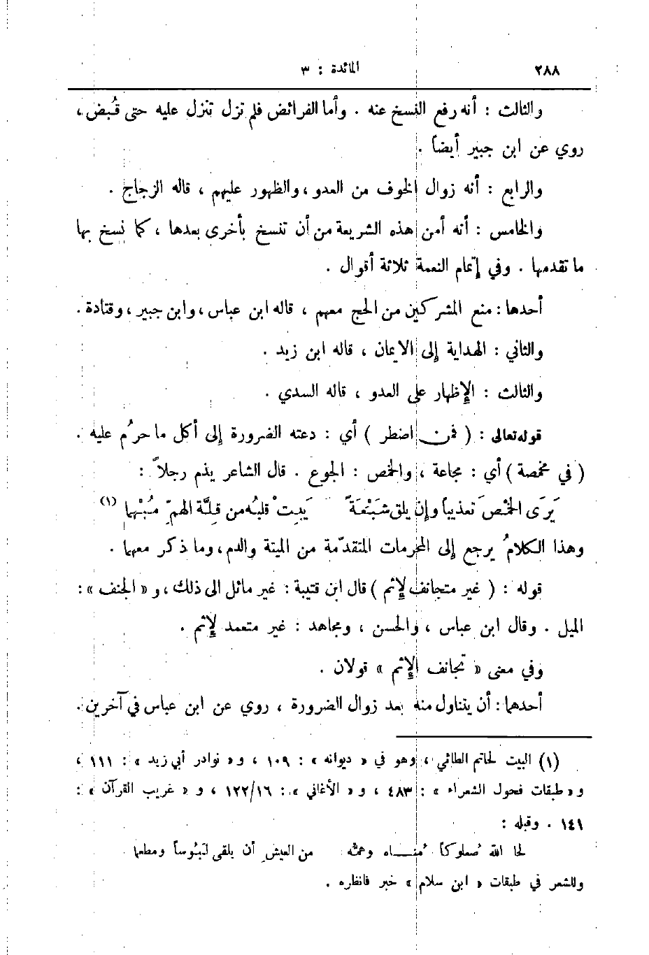 قوله تعالى فمن اضطر أي دعته الضرورة إلى أكل ما حرم عليه في مخمصة أي مجاعة والخمص الجوع قال الشاعر يذم رجلا ... يرى الخمص تعذيبا وإن يلق شبعة ... يبت قلبه من قلة الهم مبهما ...