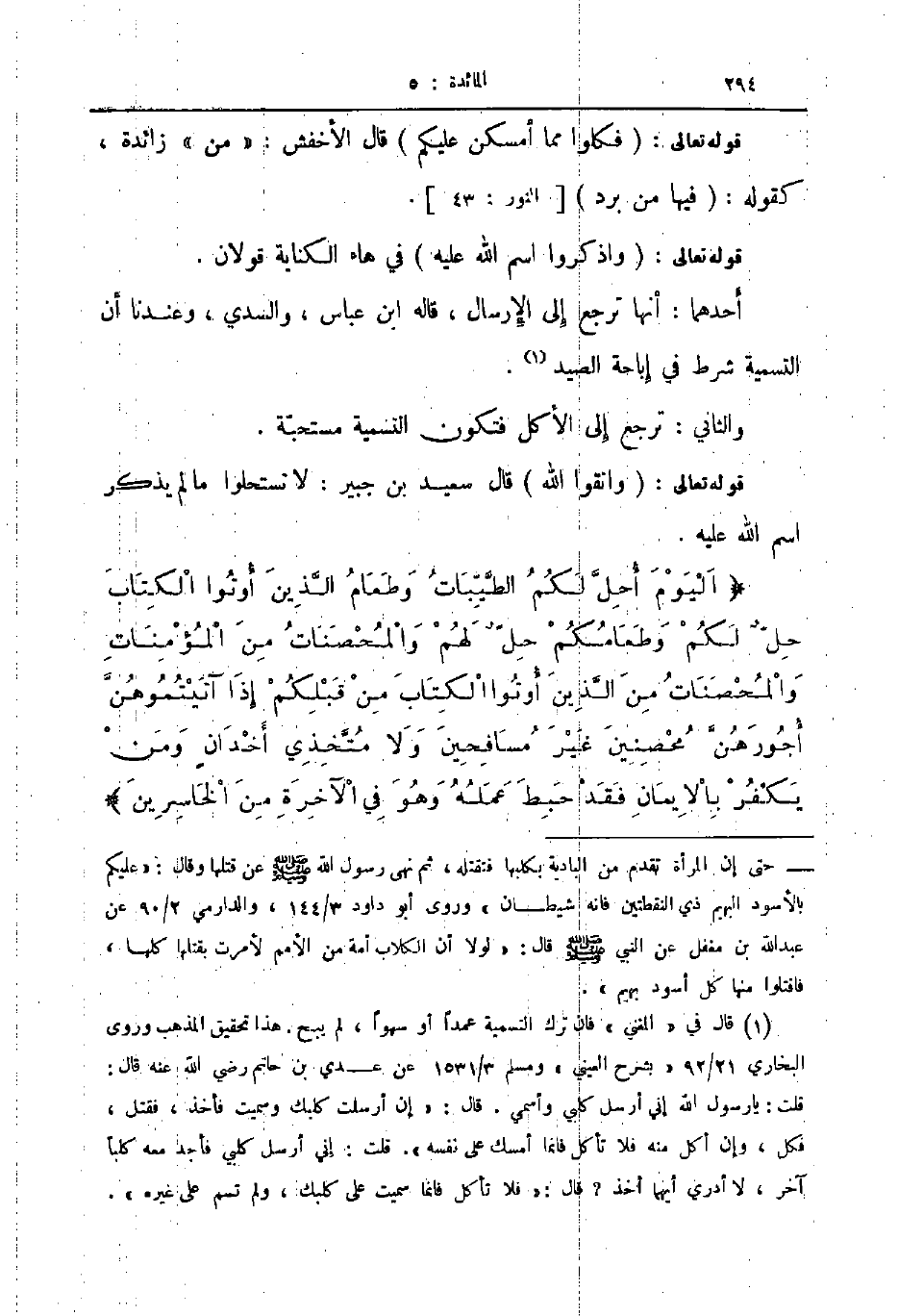 قوله تعالى واتقوا الله قال سعيد بن جبير لا تستحلوا ما لم يذكر اسم الله عليه اليوم أحل لكم الطيبات وطعام الذين أوتوا الكتاب حل لكم وطعامكم حل لهم والمحصنات من المؤمنات والمحصنات من الذين أوتوا الكتاب من قبلكم إذا آتيتموهن أجورهن محصنين غير مسافحين ولا متخذي أخدان ومن يكفر بالايمان فقد حبط عمله وهو في الآخرة من الخاسرين