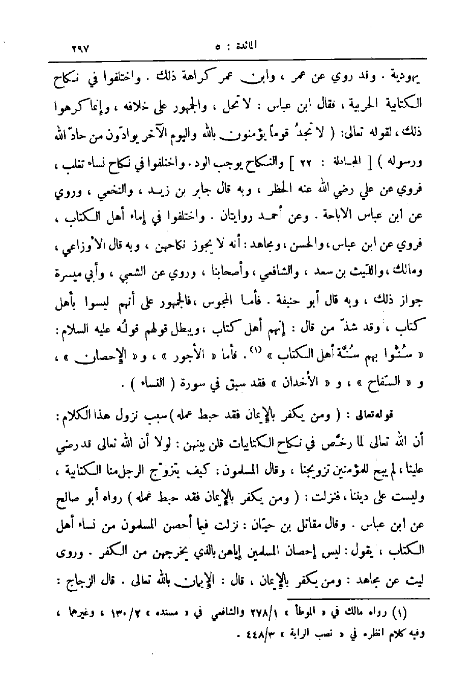 يهودية وقد روي عن عمر وابن عمر كراهة ذلك واختلفوا في نكاح الكتابية الحربية فقال ابن عباس لا تحل والجمهور على خلافه وإنما كرهوا ذلك لقوله تعالى لا تجد قوما يؤمنون بالله واليوم الآخر يوادون من حاد الله ورسوله المجادلة 22 والنكاح يوجب الود واختلفوا في نكاح نساء تغلب فروي عن علي رضي الله عنه الحظر وبه قال جابر بن زيد والنخعي وروي عن ابن عباس الاباحة وعن أحمد روايتان واختلفوا في إماء أهل الكتاب فروي عن ابن عباس والحسن ومجاهد أنه لا يجوز نكاحهن وبه قال الأوزاعي ومالك والليث بن سعد والشافعي وأصحابنا وروي عن الشعبي وأبي ميسرة جواز ذلك وبه قال أبو حنيفة فأما المجوس فالجمهور على أنهم ليسوا بأهل كتاب وقد شذ من قال إنهم أهل كتاب ويبطل قولهم قوله عليه السلام سنوا بهم سنة أهل الكتاب فأما الأجور والإحصان والسفاح والأخدان فقد سبق في سورة النساء