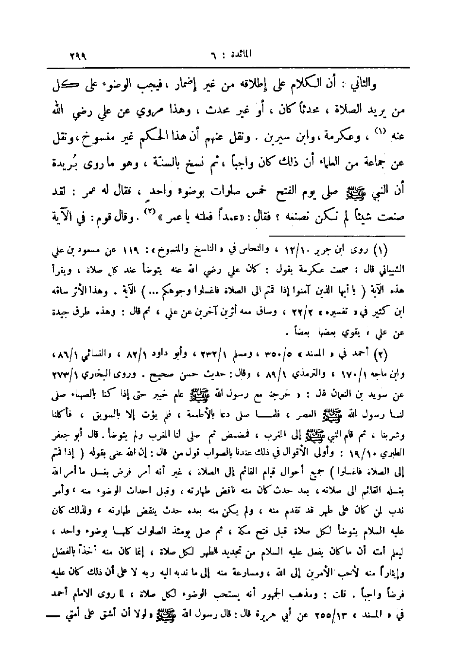 والثاني أن الكلام على إطلاقه من غير إضمار فيجب الوضوء على كل من يريد الصلاة محدثا كان أو غير محدث وهذا مروي عن علي رضي الله عنه وعكرمة وابن سيرين ونقل عنهم أن هذا الحكم غير منسوخ ونقل عن جماعة من العلماء أن ذلك كان واجبا ثم نسخ بالسنة وهو ما روى بريدة أن النبي صلى الله عليه و سلم صلى يوم الفتح خمس صلوات بوضوء واحد فقال له عمر لقد صنعت شيئا لم تكن تصنعه فقال عمدا فعلته يا عمر وقال قوم في الآية
