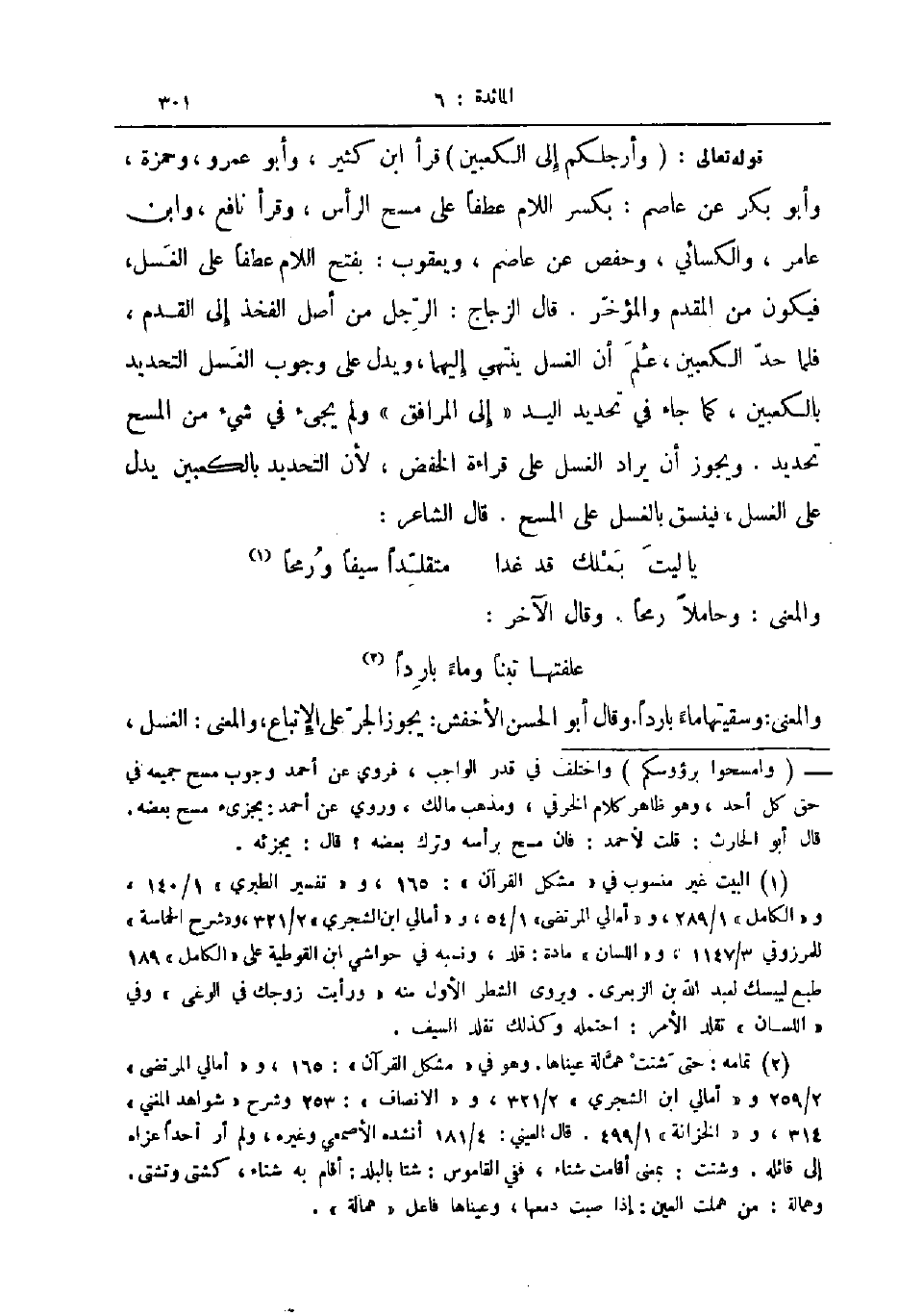 قوله تعالى وأرجلكم إلى الكعبين قرأ ابن كثير وأبو عمرو وحمزة وأبو بكر عن عاصم بكسر اللام عطفا على مسح الرأس وقرأ نافع وابن عامر والكسائي وحفص عن عاصم ويعقوب بفتح اللام عطفا على الغسل فيكون من المقدم والمؤخر قال الزجاج الرجل من أصل الفخذ إلى القدم فلما حد الكعبين علم أن الغسل ينتهي إليهما ويدل على وجوب الغسل التحديد بالكعبين كما جاء في تحديد اليد إلى المرافق ولم يجئ في شيء من المسح تحديد ويجوز أن يراد الغسل على قراءة الخفض لأن التحديد بالكعبين يدل على الغسل فينسق بالغسل على المسح قال الشاعر ... يا ليت بعلك قد غدا ... متقلدا سيفا ورمحا ...