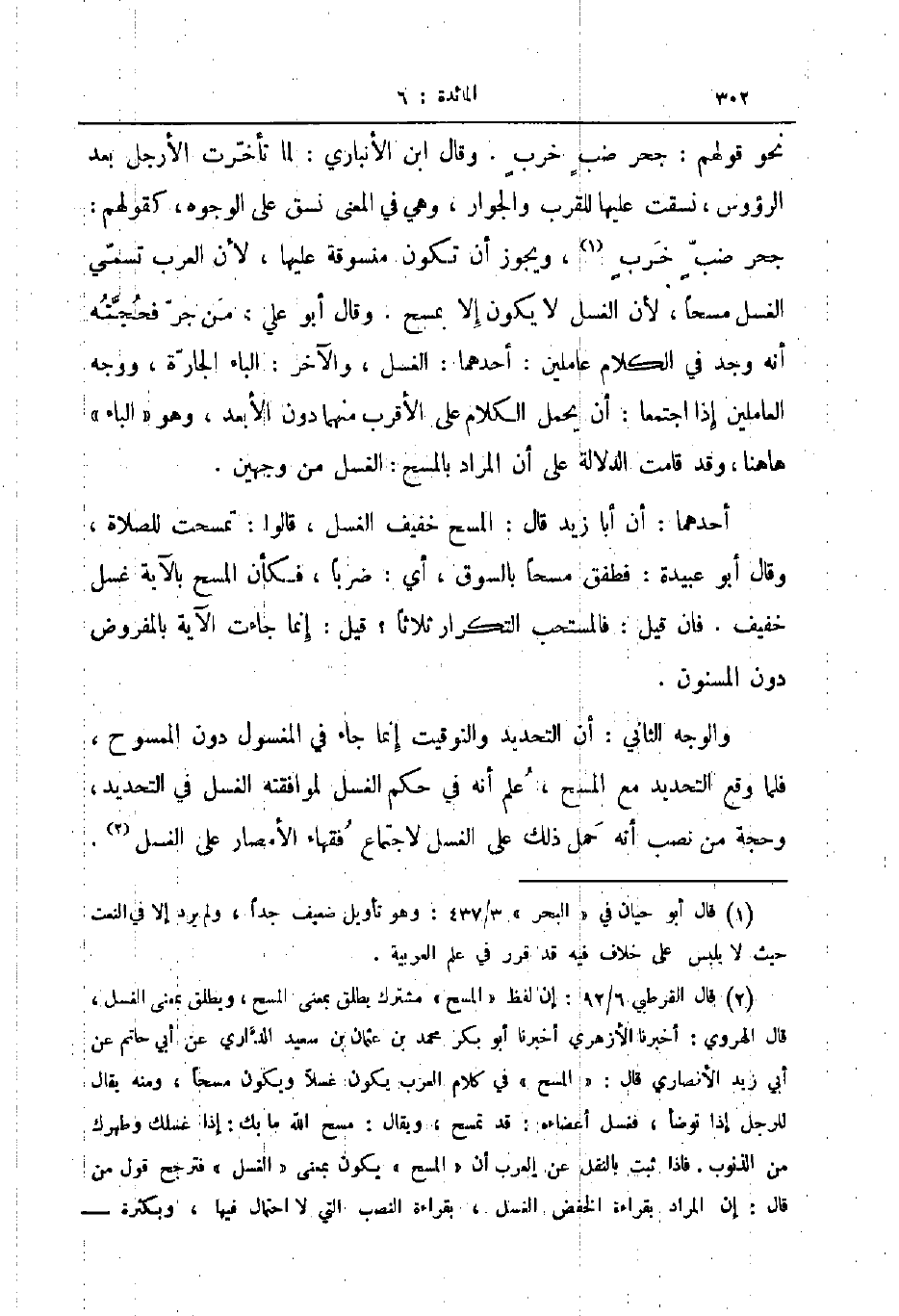 نحو قولهم جحر ضب خرب وقال ابن الأنباري لما تأخرت الأرجل بعد الرؤوس نسقت عليها للقرب والجوار وهي في المعنى نسق على الوجوه كقولهم جحر ضب خرب ويجوز أن تكون منسوقة عليها لأن العرب تسمي الغسل مسحا لأن الغسل لا يكون إلا بمسح وقال أبو علي من جر فحجته أنه وجد في الكلام عاملين أحدهما الغسل والآخر الباء الجارة ووجه العاملين إذا اجتمعا أن يحمل الكلام على الأقرب منهما دون الأبعد وهو الباء هاهنا وقد قامت الدلالة على أن المراد بالمسح الغسل من وجهين
