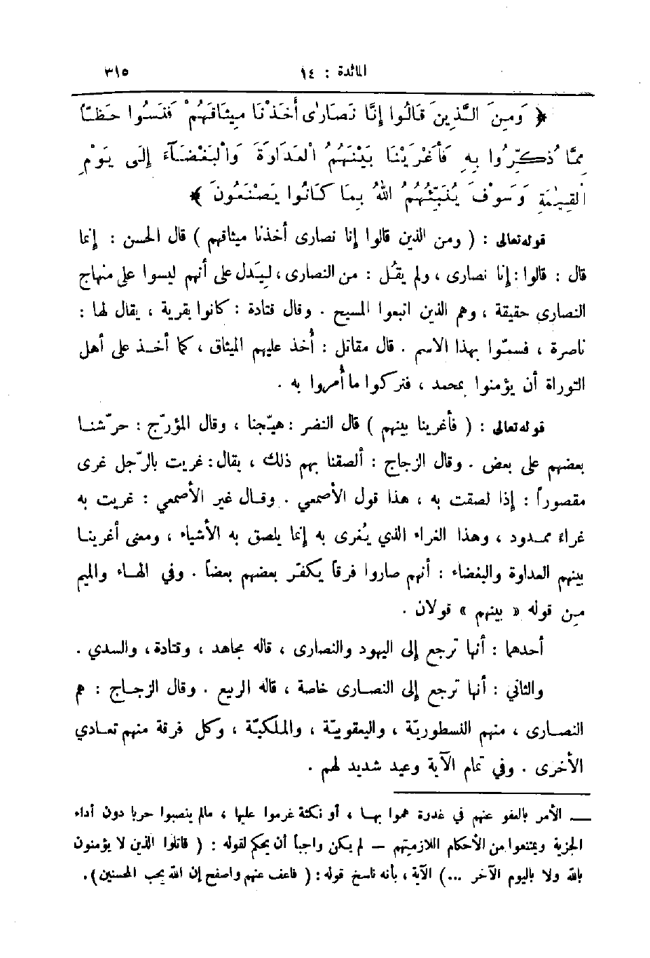 والثاني أنها ترجع إلى النصارى خاصة قاله الربيع وقال الزجاج هم النصارى منهم النسطورية واليعقوبية والملكية وكل فرقة منهم تعادي الأخرى وفي تمام الآية وعيد شديد لهم