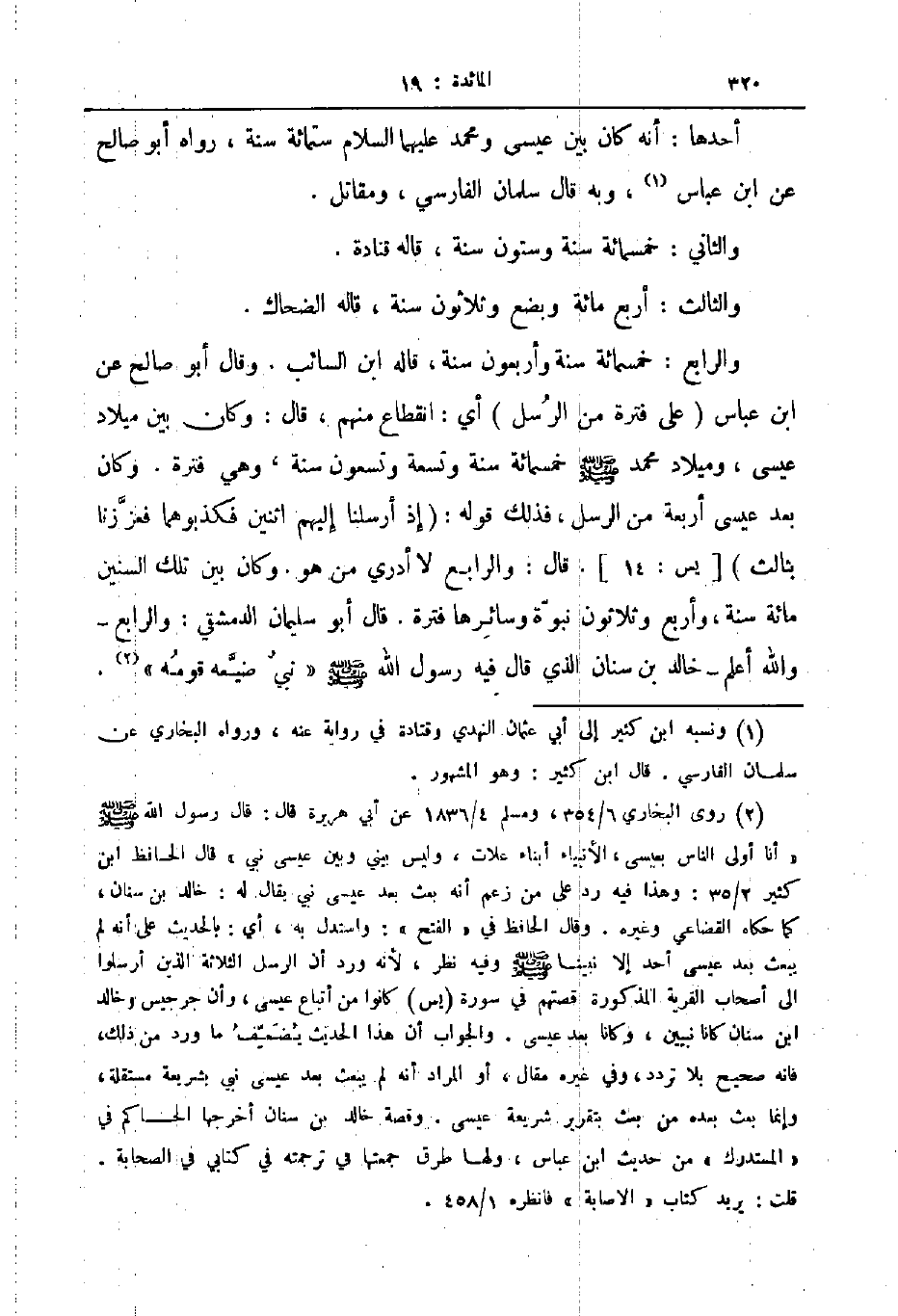 والرابع خمسمائة سنة وأربعون سنة قاله ابن السائب وقال أبو صالح عن ابن عباس على فترة من الرسل أي انقطاع منهم قال وكان بين ميلاد عيسى وميلاد محمد صلى الله عليه و سلم خمسمائة سنة وتسعة وتسعون سنة وهي فترة وكان بعد عيسى أربعة من الرسل فذلك قوله إذا أرسلنا إليهم اثنين فكذبوهما فعززنا بثالث يس 14 قال والرابع لا أدري من هو وكان بين تلك السنين مائة سنة وأربع وثلاثون نبوة وسائرها فترة قال أبو سليمان الدمشقي والرابع والله أعلم خالد بن سنان الذي قال فيه رسول الله صلى الله عليه و سلم نبي ضيعه قومه