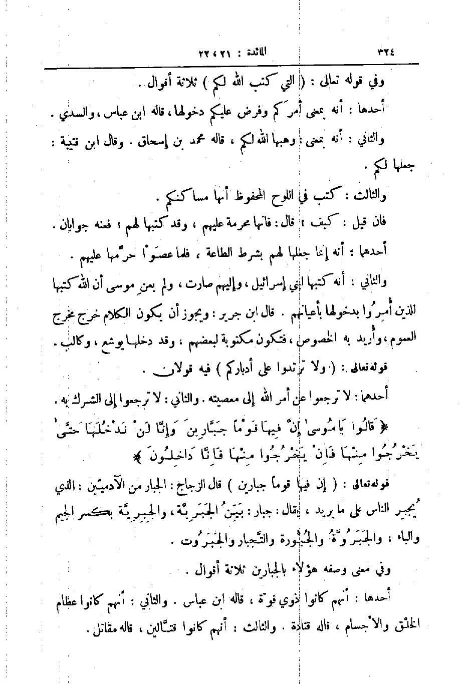أحدهما لا ترجعوا عن أمر الله إلى معصيته والثاني لا ترجعوا إلى الشرك به قالوا يا موسى إن فيها قوما جبارين وإنا لن ندخلها حتى يخرجوا منها فان يخرجوا منها فانا داخلون