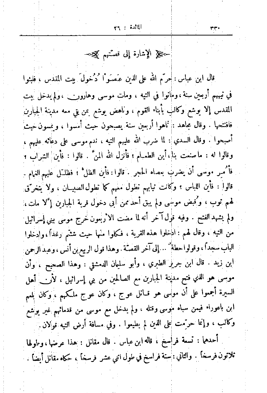 قال ابن عباس حرم الله على الذين عصوا دخول بيت المقدس فلبثوا في تيههم أربعين سنة وماتوا في التيه ومات موسى وهارون ولم يدخل بيت المقدس إلا يوشع وكالب بأبناء القوم وناهض يوشع بمن بقي معه مدينة الجبارين فافتتحها وقال مجاهد تاهوا أربعين سنة يصبحون حيث أمسوا ويمسون حيث أصبحوا وقال السدي لما ضرب الله عليهم التيه ندم موسى على دعائه عليهم وقالوا له ما صنعت بنا أين الطعام فأنزل الله المن قالوا فأين الشراب فأمر موسى أن يضرب بعصاه الحجر قالوا فأين الظل فظلل عليهم الغمام قالوا فأين اللباس وكانت ثيابهم تطول معهم كما تطول الصبيان ولا يتخرق لهم ثوب وقبض موسى ولم يبق أحد ممن أبى دخول قرية الجبارين إلا مات ولم يشهد الفتح وفيه قول آخر أنه لما مضت الأربعون خرج موسى ببني إسرائيل من التيه وقال لهم ادخلوا هذه القرية فكلوا منها حيث شئتم رغدا وادخلوا الباب سجدا وقولوا حطة إلى آخر القصة وهذا قول الربيع بن أنس وعبدالرحمن ابن زيد قال ابن ابن جرير الطبري وأبو سليمان الدمشقي وهذا الصحيح وأن موسى هو الذي فتح مدينة الجبارين مع الصالحين من بني إسرائيل لأن أهل السيرة أجمعوا على أن موسى هو قاتل عوج وكان عوج ملكهم وكان بلعم ابن باعوراء فيمن سباه موسى وقتله ولم يدخل مع موسى من قدمائهم غير يوشع وكالب وإنما حرمت على الذين لم يطيعوا وفي مسافة أرض التيه قولان
