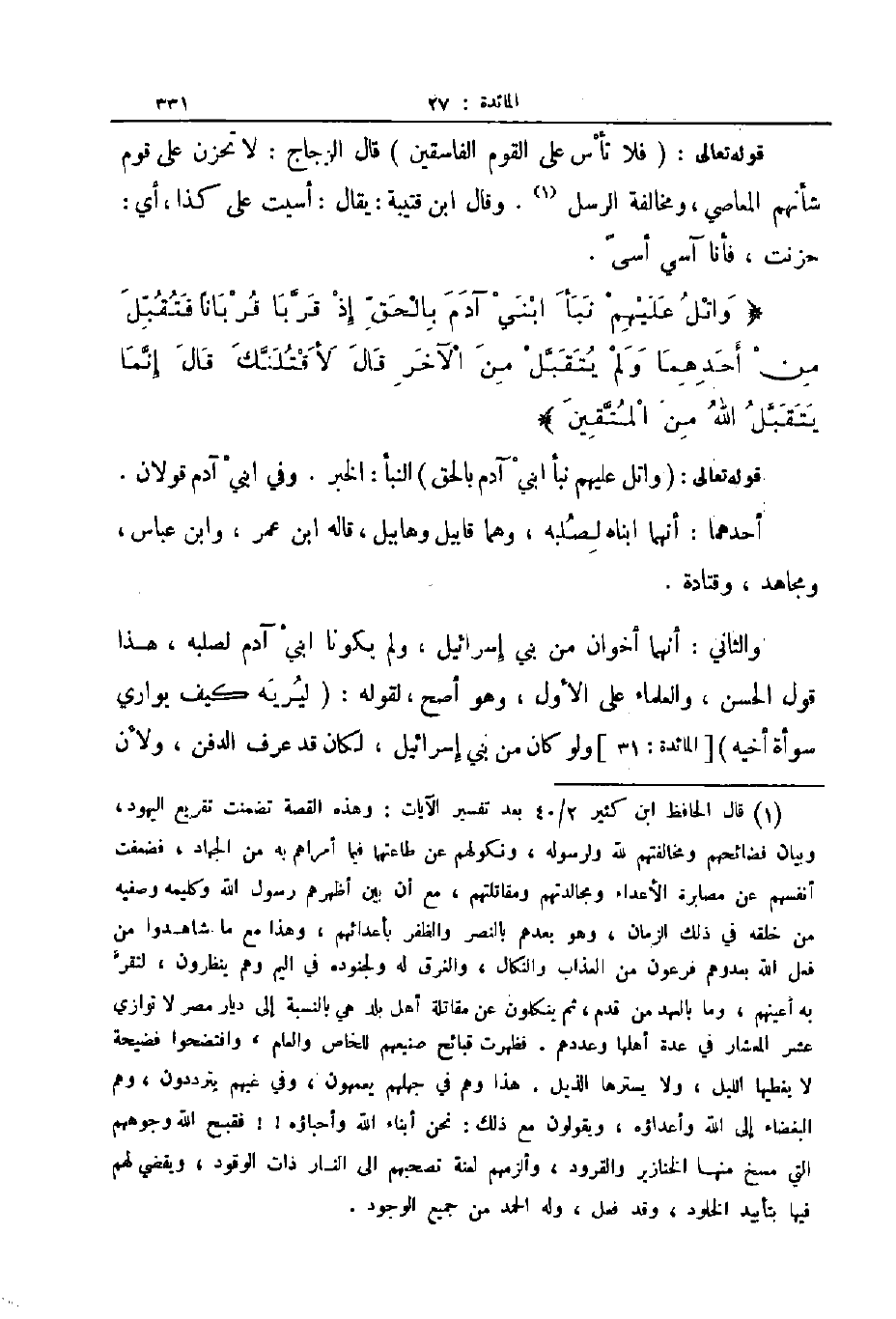 قوله تعالى فلا تأس على القوم الفاسقين قال الزجاج لا تحزن على قوم شأنهم المعاصي ومخالفة الرسل وقال ابن قتيبة يقال أسيت على كذا أي حزنت فأنا آسي أسى واتل عليهم نبأ ابني آدم بالحق إذ قربا قربانا فتقبل من أحدهما ولم يتقبل من الآخر قال لأقتلنك قال إنما يتقبل الله من المتقين