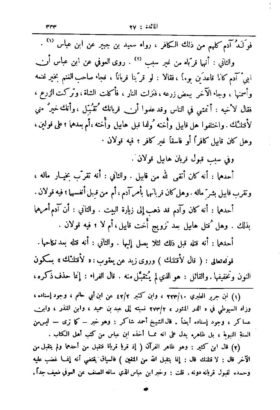 والثاني أنهما قرباه من غير سبب روى العوفي عن ابن عباس أن ابني آدم كانا قاعدين يوما فقالا لو قربنا قربانا فجاء صاحب الغنم بخير غنمه وأسمنها وجاء الآخر ببعض زرعه فنزلت النار فأكلت الشاة وتركت الزرع فقال لأخيه أتمشي في الناس وقد علموا أن قربانك تقبل وأنك خير مني لأقتلنك واختلفوا هل قابيل وأخته ولدا قبل هابيل وأخته أم بعدهما على قولين وهل كان قابيل كافرا أو فاسقا غير كافر فيه قولان