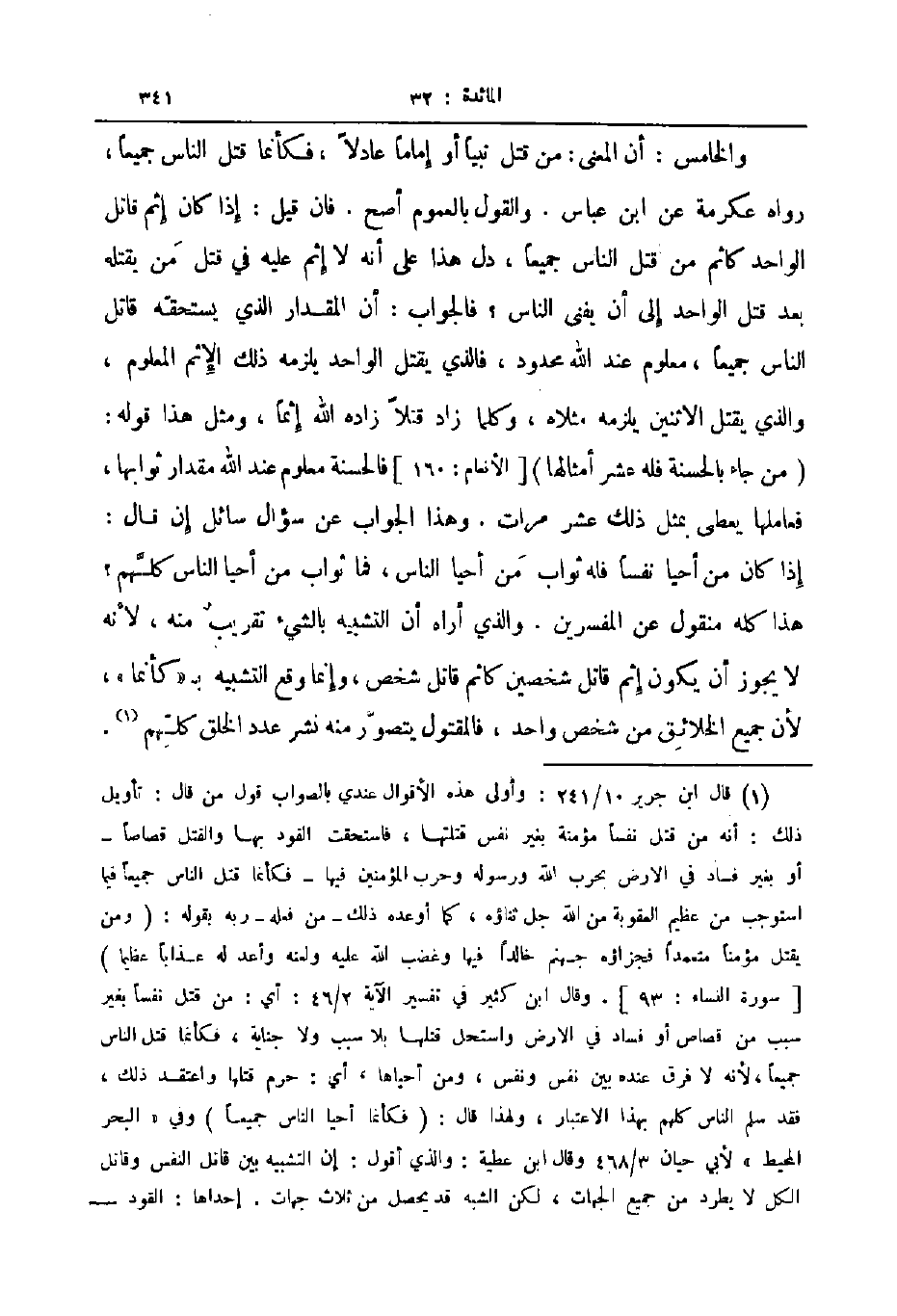 والخامس أن المعنى من قتل نبيا أو إماما عادلا فكأنما قتل الناس جميعا رواه عكرمة عن ابن عباس والقول بالعموم أصح فان قيل إذا كان إثم قاتل الواحد كاثم من قتل الناس جميعا دل هذا على أنه لا إثم عليه في قتل من يقتله بعد قتل الواحد إلى أن يفنى الناس فالجواب أن المقدار الذي يستحقه قاتل الناس جميعا معلوم عند الله محدود فالذي يقتل الواحد يلزمه ذلك الإثم المعلوم والذي يقتل الاثنين يلزمه مثلاه وكلما زاد قتلا زاده الله إثما ومثل هذا قوله من جاء بالحسنة فله عشرة أمثالها الأنعام 160 فالحسنة معلوم عند الله مقدار ثوابها فعاملها يعطى بمثل ذلك عشر مرات وهذا الجواب عن سؤال سائل إن قال إذا كان من أحيا نفسا فله ثواب من أحيا الناس فما ثواب من أحيا الناس كلهم هذا كله منقول عن المفسرين والذي أراه أن التشبيه بالشيء تقريب منه لأنه لا يجوز أن يكون إثم قاتل شخصين كاثم قاتل شخص وإنما وقع التشبيه ب كأنما لأن جميع الخلائق من شخص واحد فالمقتول يتصور منه نشر عدد الخلق كلهم