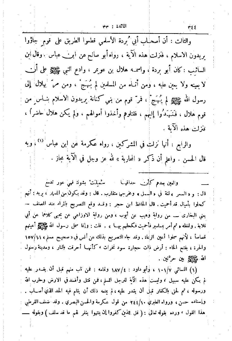 والرابع أنها نزلت في المشركين رواه عكرمة عن ابن عباس وبه قال الحسن واعلم أن ذكر المحاربة لله عز و جل في الآية مجاز