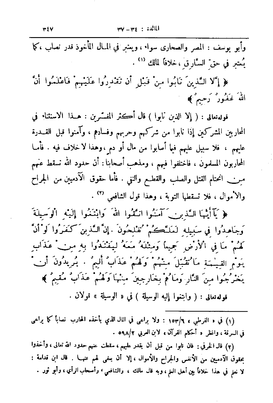 قوله تعالى إلا الذين تابوا قال أكثر المفسرين هذا الاستثناء في المحاربين المشركين إذا تابوا من شركهم وحربهم وفسادهم وآمنوا قبل القدرة عليهم فلا سبيل عليهم فيما أصابوا من مال أو دم وهذا لا خلاف فيه فأما المحاربون المسلمون فاختلفوا فيهم ومذهب أصحابنا أن حدود الله تسقط عنهم من انحتام القتل والصلب والقطع والنفي فأما حقوق الآدميين من الجراح والأموال فلا تسقطها التوبة وهذا قول الشافعي يآ أيها الذين آمنوا اتقوا الله وابتغوا إليه الوسيلة وجاهدوا في سبيله لعلكم تفلحون إن الذين كفروا لو أن لهم ما في الأرض جميعا ومثله معه ليفتدوا به من عذاب يوم القيمة ما تقبل منهم ولهم عذاب أليم يريدون أن يخرجوا من النار وما هم بخارجين منها ولهم عذاب مقيم