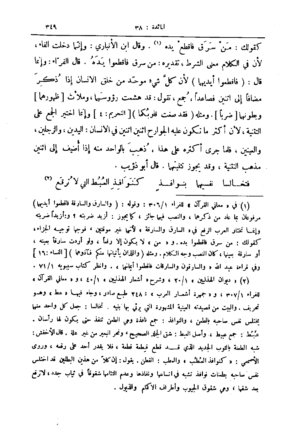 كقولك من سرق فاقطع يده وقال ابن الأنباري وإنما دخلت الفاء لأن في الكلام معنى الشرط تقديره من سرق فاقطعوا يده قال الفراء وإنما قال فاقطعوا أيديهما لأن كل شيء موحد من خلق الإنسان إذا ذكر مضافا إلى اثنين فصاعدا جمع تقول قد هشمت رؤوسهما وملأت ظهورهما وبطونهما ضربا ومثله فقد صنعت قلوبكما التحريم 4 وإنما اختير الجمع على التثنية لأن أكثر ما تكون عليه الجوارح اثنين اثنين في الانسان اليدين والرجلين والعينين فلما جرى أكثره على هذا ذهب بالواحد منه إذا أضيف إلى اثنين مذهب التثنية وقد يجوز تثنيتهما قال أبو ذؤيب ... فتخالسا نفسيهما بنوافذ ... كنوافذ العبط التي لا ترقع