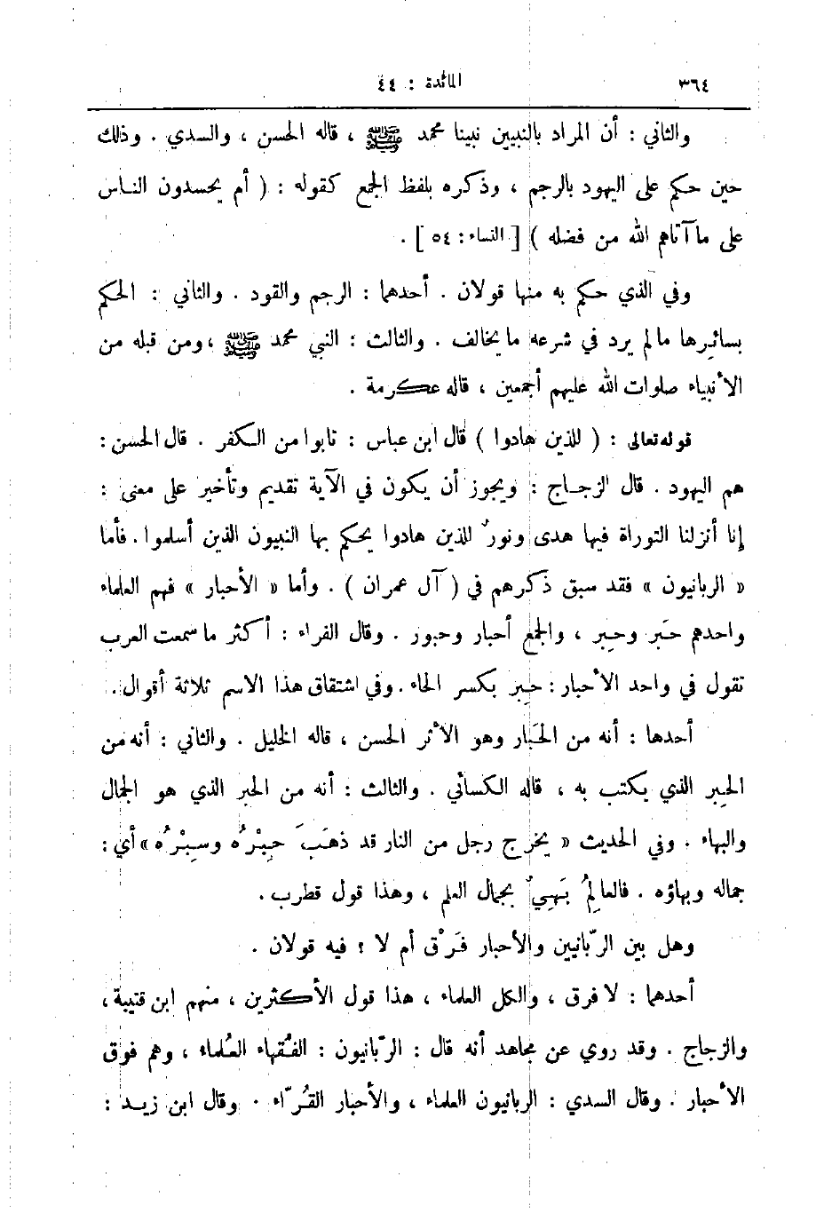 قوله تعالى للذين هادوا قال ابن عباس تابوا من الكفر قال الحسن هم اليهود قال الزجاج ويجوز أن يكون في الآية تقديم وتأخير على معنى إنا أنزلنا التوراة فيها هدى ونور للذين هادوا يحكم بها النبيون الذين أسلموا فأما الربانيون فقد سبق ذكرهم في آل عمران وأما الأحبار فهم العلماء واحدهم حبر و حبر والجمع أحبار وحبور وقال الفراء أكثر ما سمعت العرب تقول في واحد الأحبار حبر بكسر الحاء وفي اشتقاق هذا الاسم ثلاثة أقوال