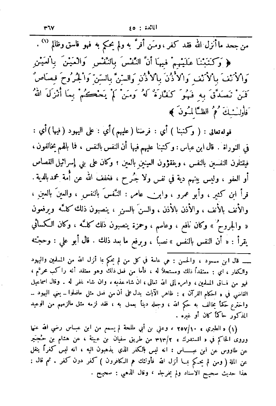 من جحد ما أنزل الله فقد كفر ومن أقر به ولم يحكم به فهو فاسق وظالم وكتبنا عليهم فيها أن النفس بالنفس والعين بالعين والأنف بالأنف والأذن بالأذن والسن بالسن والجروح قصاص فمن تصدق به فهو كفارة له ومن لم يحكم بما أنزل الله فأولئك هم الظالمون