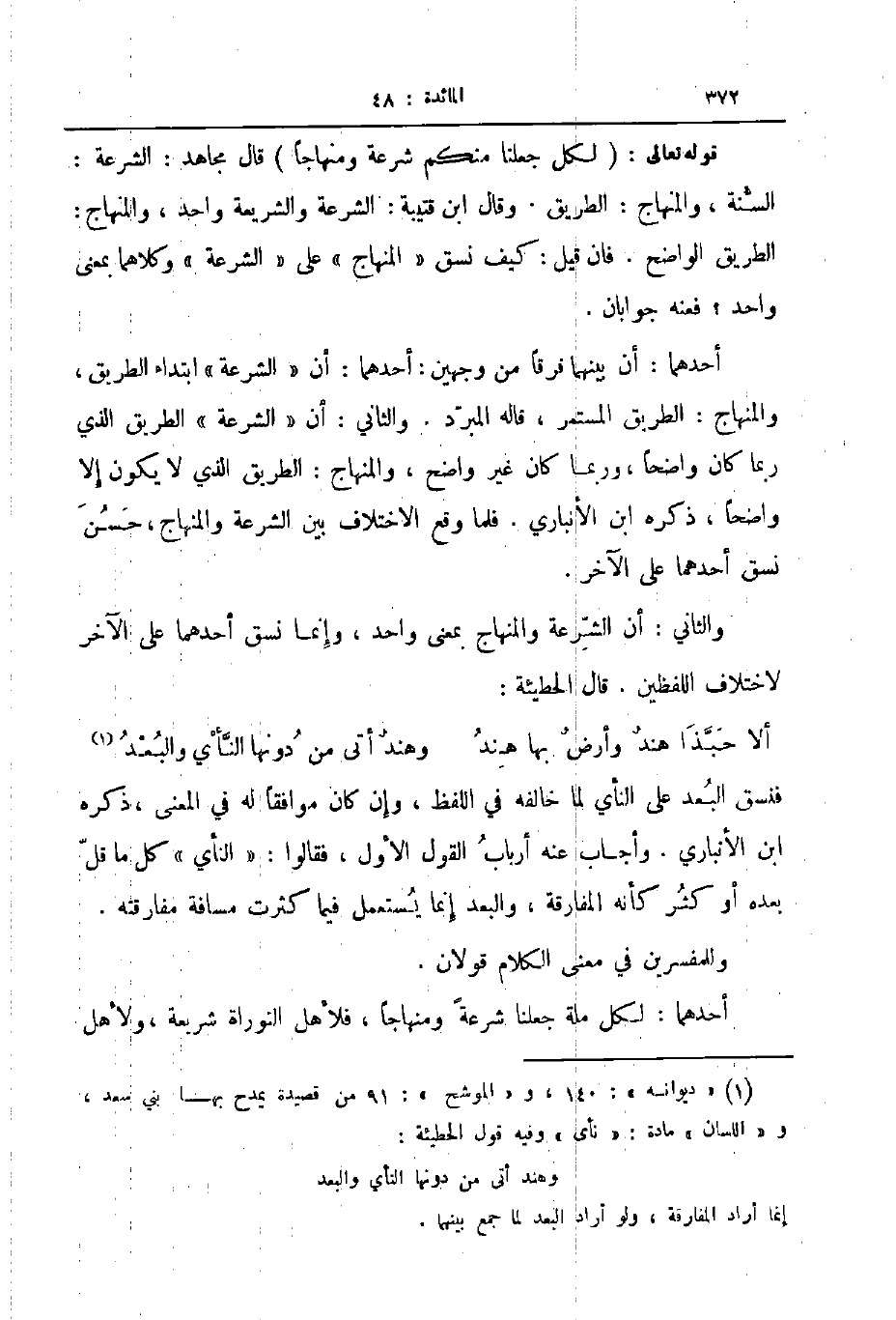 والثاني أن الشرعة والمنهاج بمعنى واحد وإنما نسق أحدهما على الآخر لاختلاف اللفظين قال الحطيئة ... ألا حبذا هند وأرض بها هند ... وهند أتى من دونها النأي والبعد ...