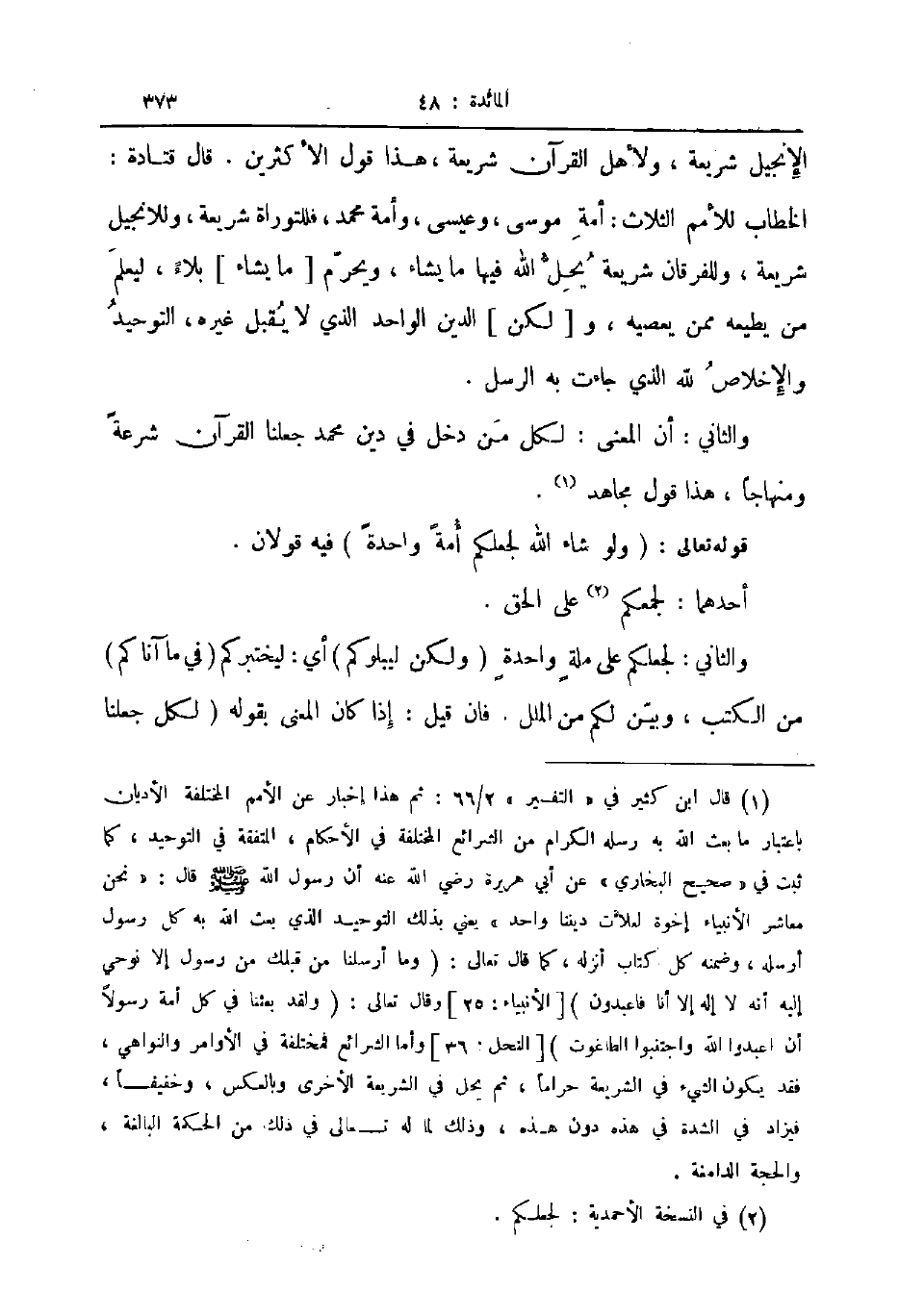 الإنجيل شريعة ولأهل القرآن شريعة هذا قول الأكثرين قال قتادة الخطاب للأمم الثلاث أمة موسى وعيسى وأمة محمد فللتوراة شريعة وللانجيل شريعة وللفرقان شريعة يحل الله فيها ما يشاء ويحرم ما يشاء بلاء ليعلم من يطيعه ممن يعصيه ولكن الدين الواحد الذي لا يقبل غيره التوحيد والإخلاص لله الذي جاءت به الرسل