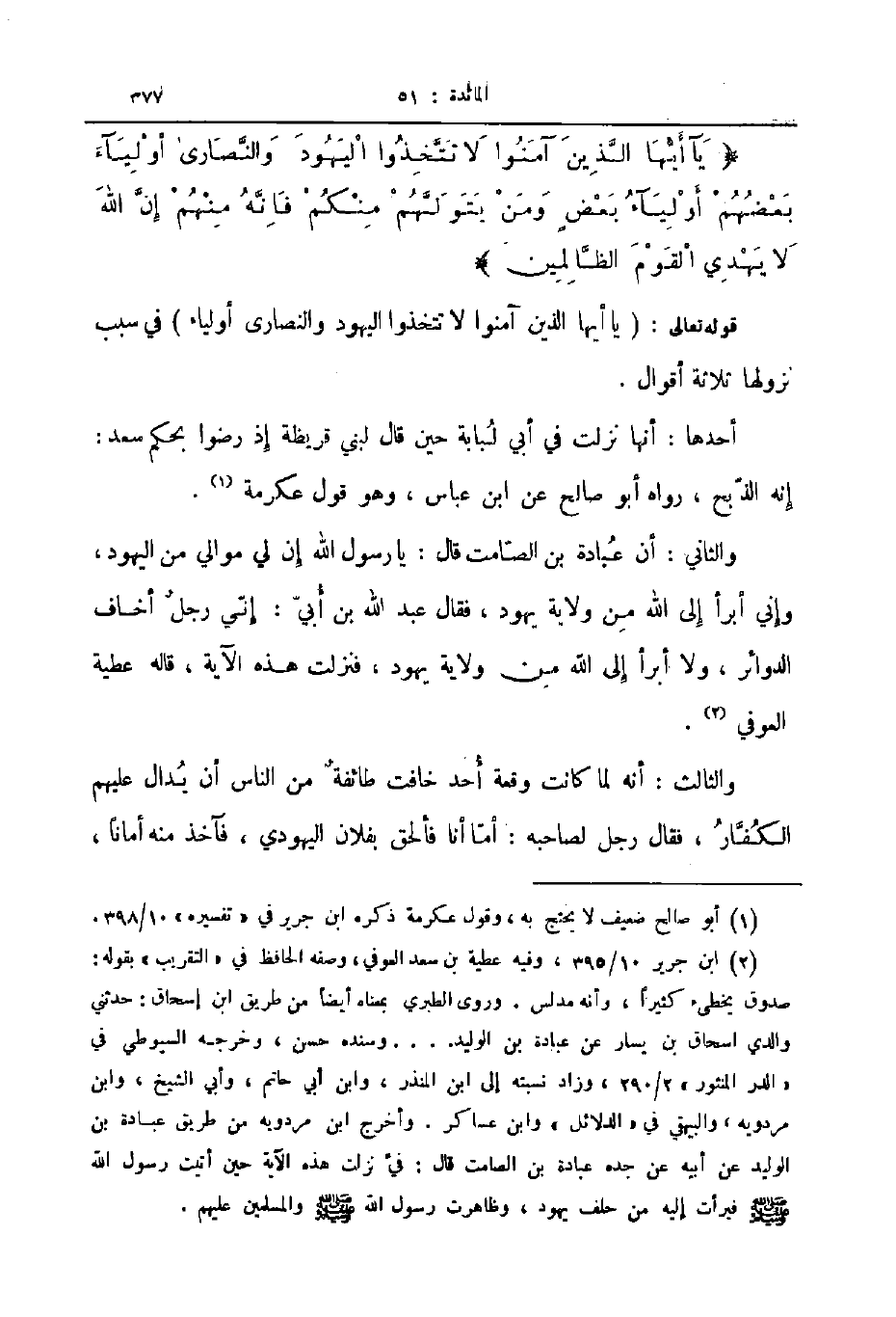 والثاني أن عبادة بن الصامت قال يا رسول الله إن لي موالي من اليهود وإني أبرأ إلى الله من ولاية يهود فقال عبد الله بن أبي إني رجل أخاف الدوائر ولا أبرأ إلى الله من ولاية يهود فنزلت هذه الآية قاله عطية العوفي