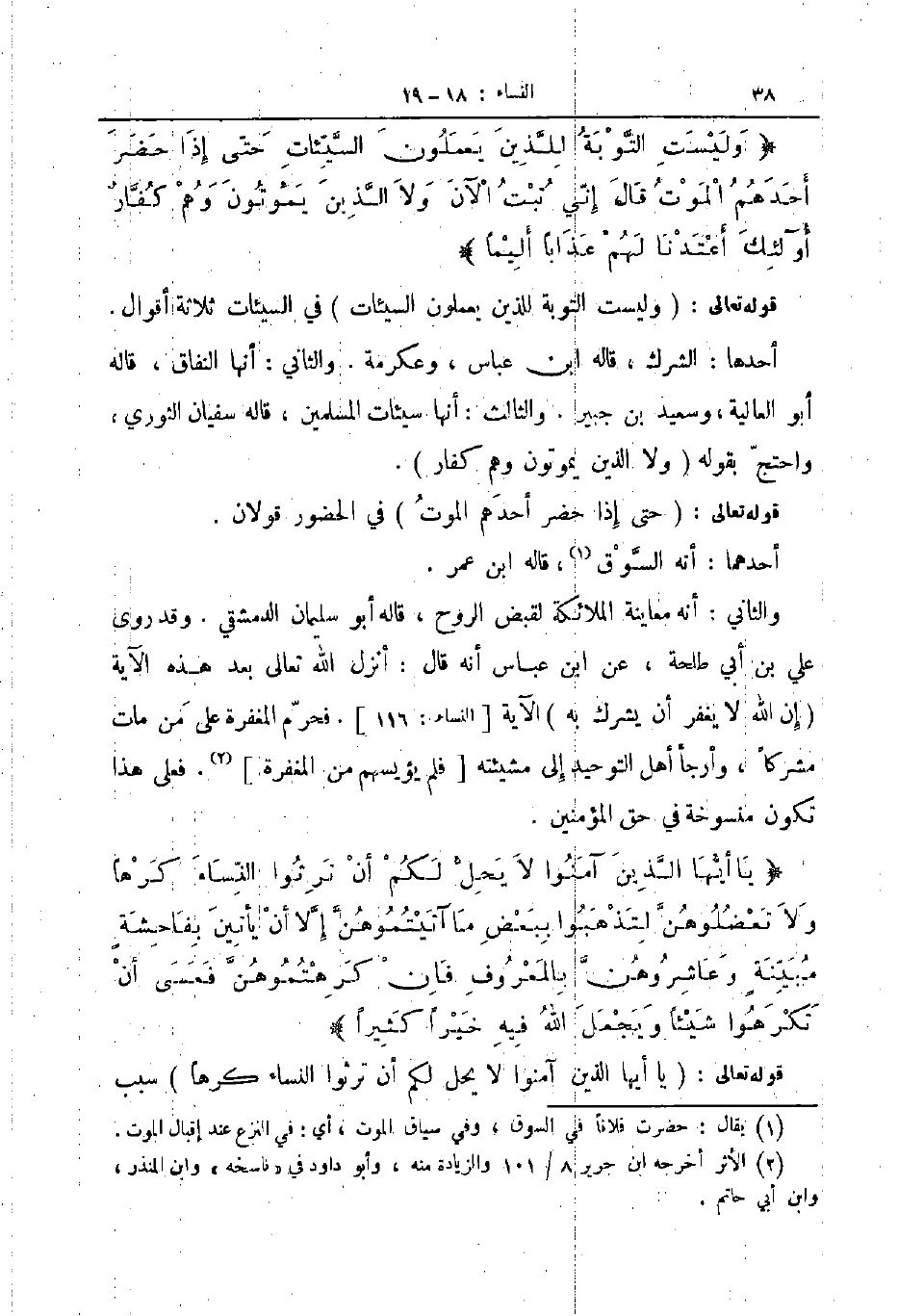 والثاني أنه معاينة الملائكة لقبض الروح قاله أبو سليمان الدمشقي وقد روى علي بن أبي طلحة عن ابن عباس أنه قال أنزل الله تعالى بعد هذه الآية إن الله لا يغفر أن يشرك به الآية النساء 116 فحرم المغفرة على من مات مشركا وأرجأ أهل التوحيد إلى مشيئته فلم يؤيسهم من المغفرة فعلى هذا تكون منسوخة في حق المؤمنين يا أيها الذين آمنوا لا يحل لكم أن ترثوا النساء كرها ولا تعضلوهن لتذهبوا ببعض ما آتيتموهن إلا أن يأتين بفاحشة مبينة وعاشروهن بالمعروف فان كرهتموهن فعسى أن تكرهوا شيئا ويجعل الله فيه خيرا كثيرا