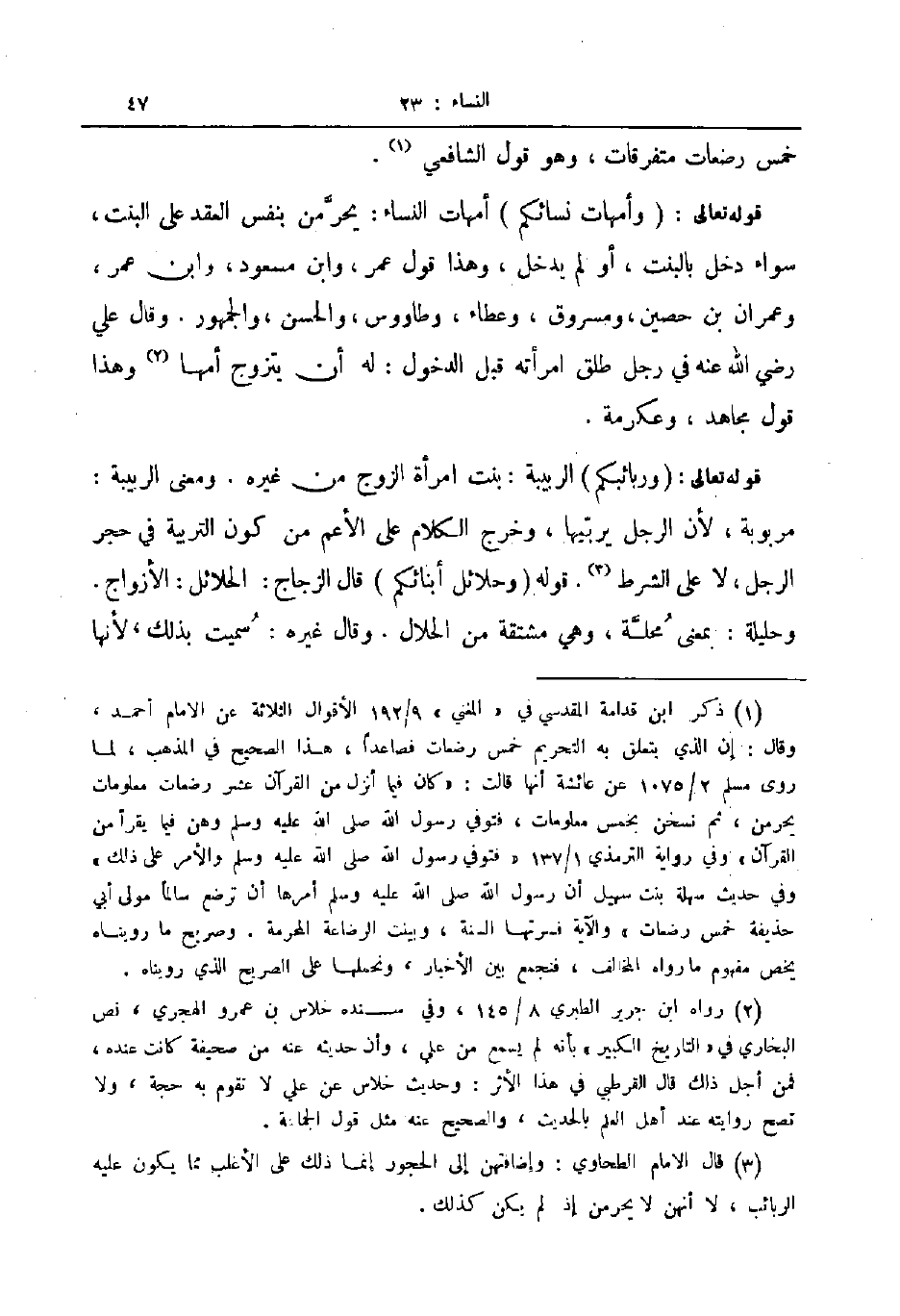 قوله تعالى وأمهات نسائكم أمهات النساء يحرمن بنفس العقد على البنت سواء دخل بالبنت أو لم يدخل وهذا قول عمر وابن مسعود وابن عمر وعمران بن حصين ومسروق وعطاء وطاووس والحسن والجمهور وقال علي رضي الله عنه في رجل طلق امرأته قبل الدخول له أن يتزوج أمها وهذا قول مجاهد وعكرمة