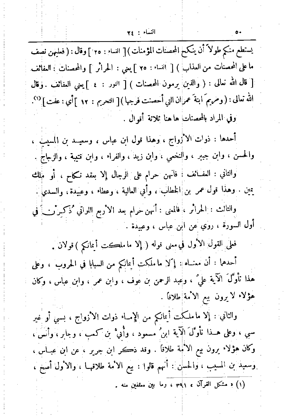 والثاني العفائف فانهن حرام على الرجال إلا بعقد نكاح أو ملك يمين وهذا قول عمر بن الخطاب وأبي العالية وعطاء وعبيدة والسدي