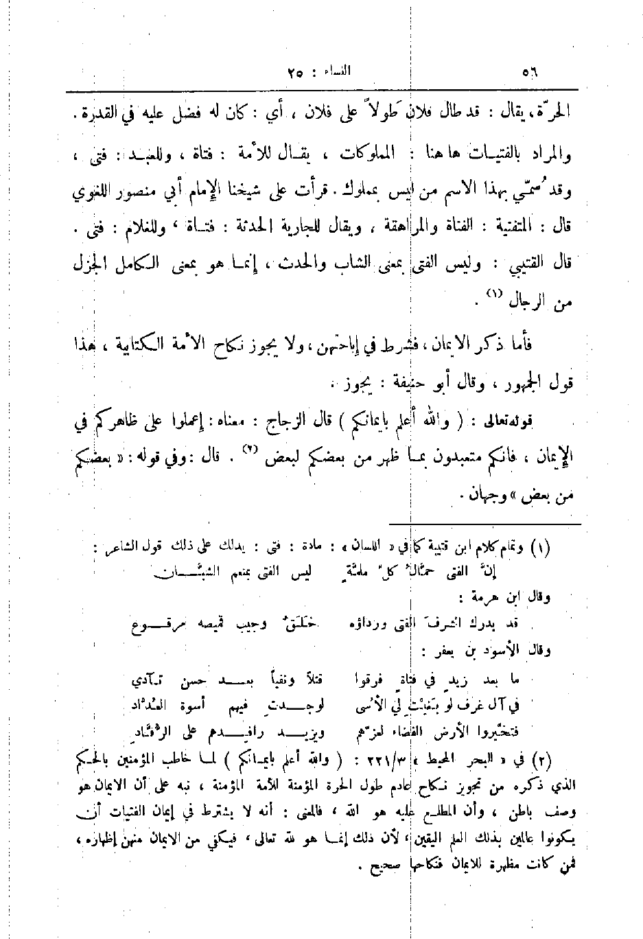 والمراد بالفتيات هاهنا المملوكات يقال للأمة فتاة وللعبد فتى وقد سمي بهذا الاسم من ليس بمملوك قرأت على شيخنا الإمام أبي منصور اللغوي قال المتفتية الفتاة والمراهقة ويقال للجارية الحدثة فتاة وللغلام فتى قال القتيبي وليس الفتى بمعنى الشاب والحدث إنما هو بمعنى الكامل الجزل من الرجال