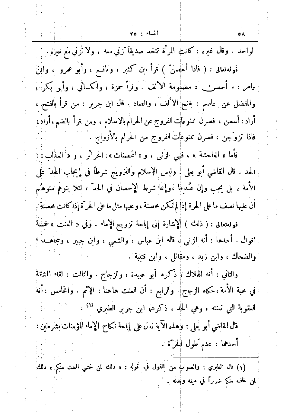 قال القاضي أبو يعلى وهذه الآية تدل على إباحة نكاح الإماء المؤمنات بشرطين أحدهما عدم طول الحرة