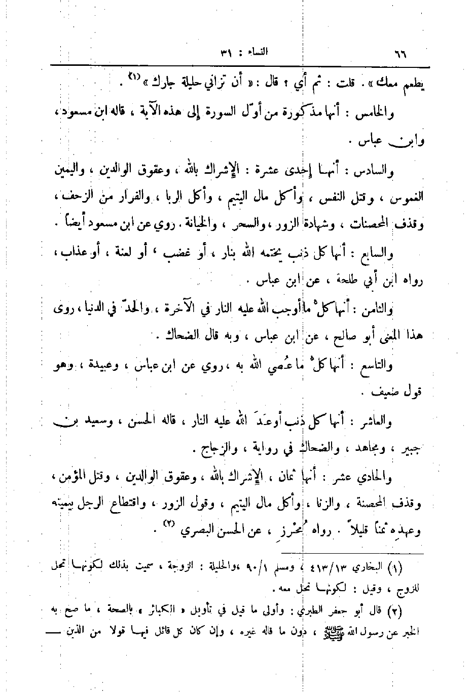 والحادي عشر أنها ثمان الإشراك بالله وعقوق الوالدين وقتل المؤمن وقذف المحصنة والزنا وأكل مال اليتيم وقول الزور واقتطاع الرجل بيمينه وعهده ثمنا قليلا رواه محرز عن الحسن البصري