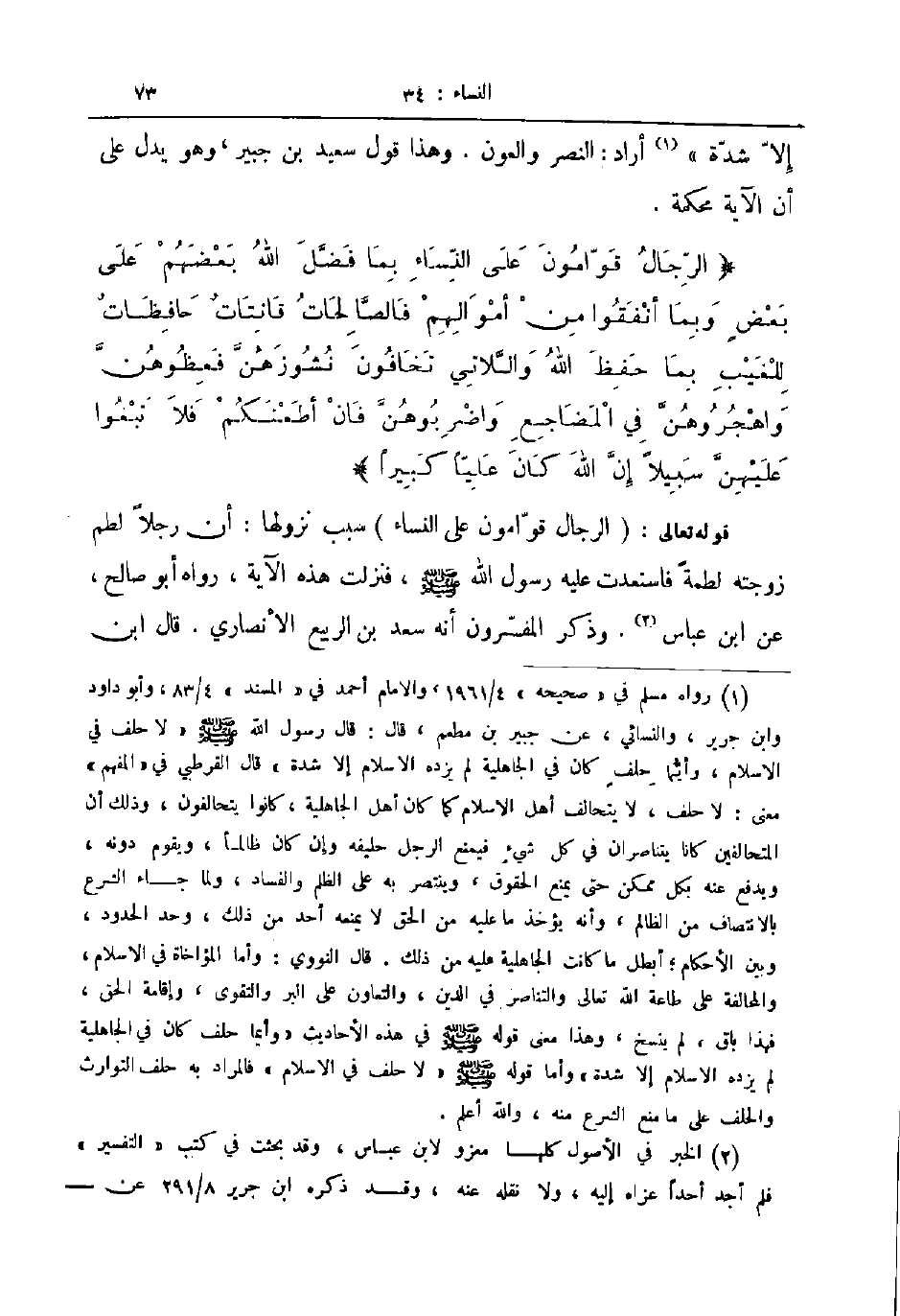 إلا شدة أراد النصر والعون وهذا قول سعيد بن جبير وهو يدل على أن الآية محكمة الرجال قوامون على النساء بما فضل الله بعضهم على بعض وبما أنفقوا من أموالهم فالصالحات قانتات حافظات للغيب بما حفظ الله واللاتي تخافون نشوزهن فعظوهن واهجروهن في المضاجع واضربوهن فان أطعنكم فلا تبغوا عليهن سبيلا إن الله كان عليا كبيرا