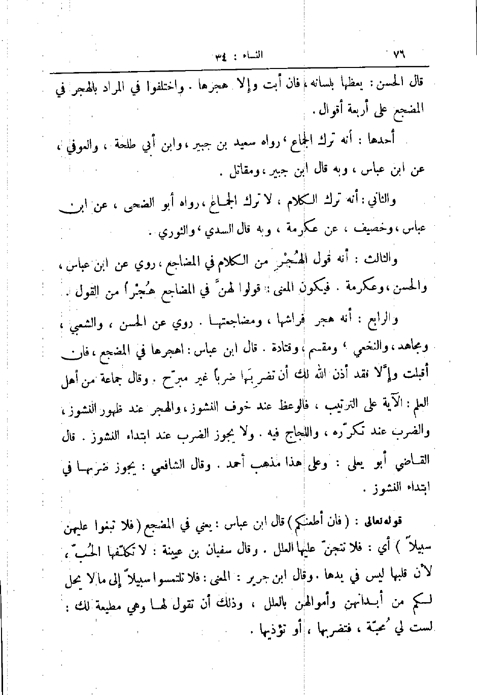 والرابع أنه هجر فراشها ومضاجعتها روي عن الحسن والشعبي ومجاهد والنخعي ومقسم وقتادة قال ابن عباس اهجرها في المضجع فان أقبلت وإلا فقد أذن الله لك أن تضربها ضربا غير مبرح وقال جماعة من أهل العلم الآية على الترتيب فالوعظ عند خوف النشوز والهجر عند ظهور النشوز والضرب عند تكرره واللجاج فيه ولا يجوز الضرب عند ابتداء النشوز قال القاضي أبو يعلى وعلى هذا مذهب أحمد وقال الشافعي يجوز ضربها في ابتداء النشوز