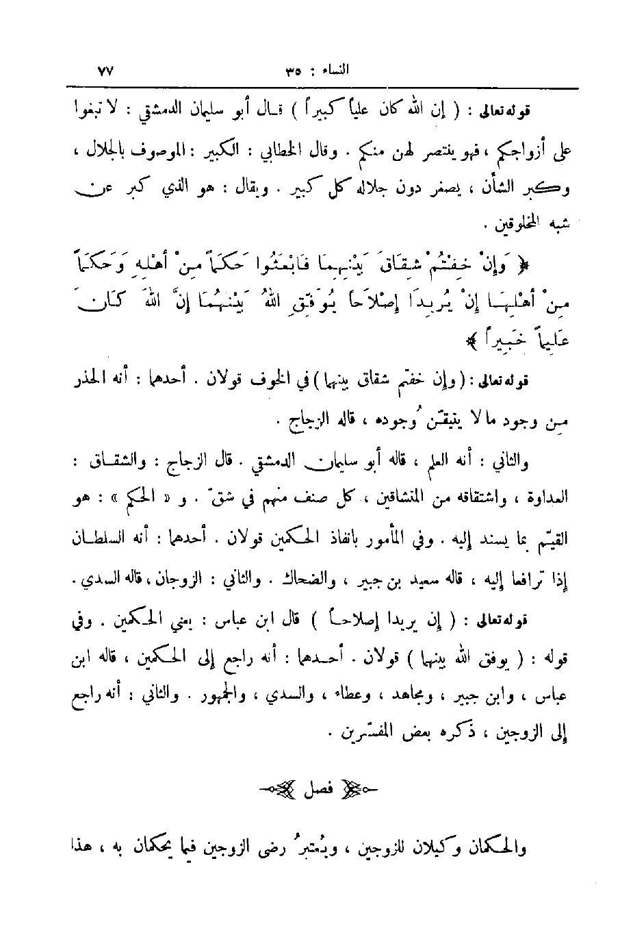 قوله تعالى إن الله كان عليا كبيرا قال أبو سليمان الدمشقي لا تبغوا على أزواجكم فهو ينتصر لهن منكم وقال الخطابي الكبير الموصوف بالجلال وكبر الشأن يصغر دون جلاله كل كبير ويقال هو الذي كبر عن شبه المخلوقين وإن خفتم شقاق بينهما فابعثوا حكما من أهله وحكما من أهلها إن يريدا إصلاحا يوفق الله بينهما إن الله كان عليما خبيرا