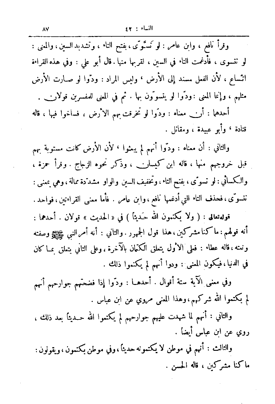 وقرأ نافع وابن عامر لو تسوى بفتح التاء وتشديد السين والمعنى لو تتسوى فأدغمت التاء في السين لقربها منها قال أبو علي وفي هذه القراءة اتساع لأن الفعل مسند إلى الأرض وليس المراد ودوا لو صارت الأرض مثلهم وإنما المعنى ودوا لو يتسوون بها ثم في المعنى للمفسرين قولان