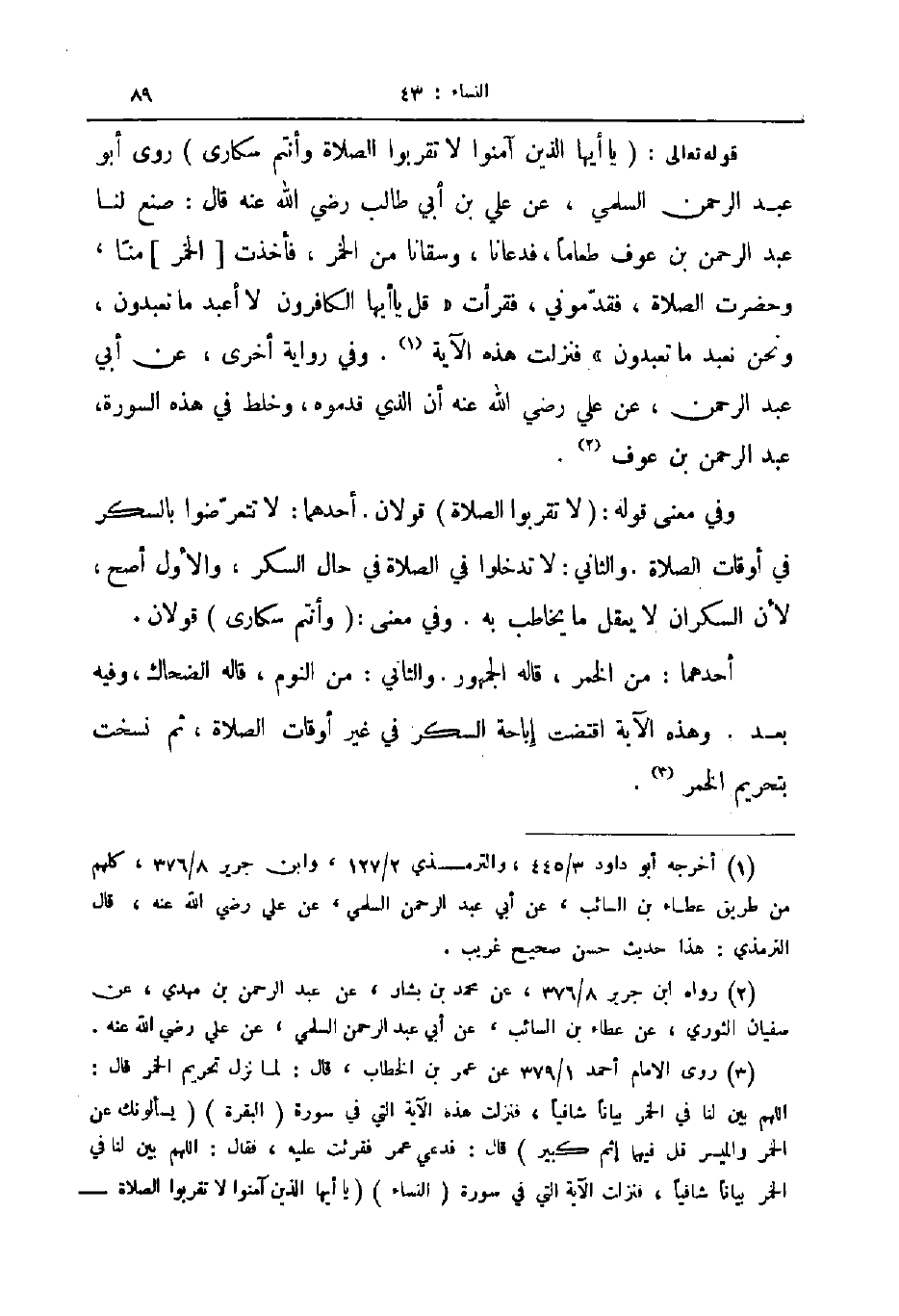 قوله تعالى يا أيها الذين آمنوا لا تقربوا الصلوة وأنتم سكارى روى أبو عبدالرحمن السلمي عن علي بن أبي طالب رضي الله عنه قال صنع لنا عبدالرحمن بن عوف طعاما فدعانا وسقانا من الخمر فأخذت الخمر منا وحضرت الصلاة فقدموني فقرأت قل يا أيها الكافرون لا أعبد ما تعبدون ونحن نعبد ما تعبدون فنزلت هذه الآية وفي رواية أخرى عن أبي عبدالرحمن عن علي رضي الله عنه أن الذي قدموه وخلط في هذه السورة عبدالرحمن بن عوف