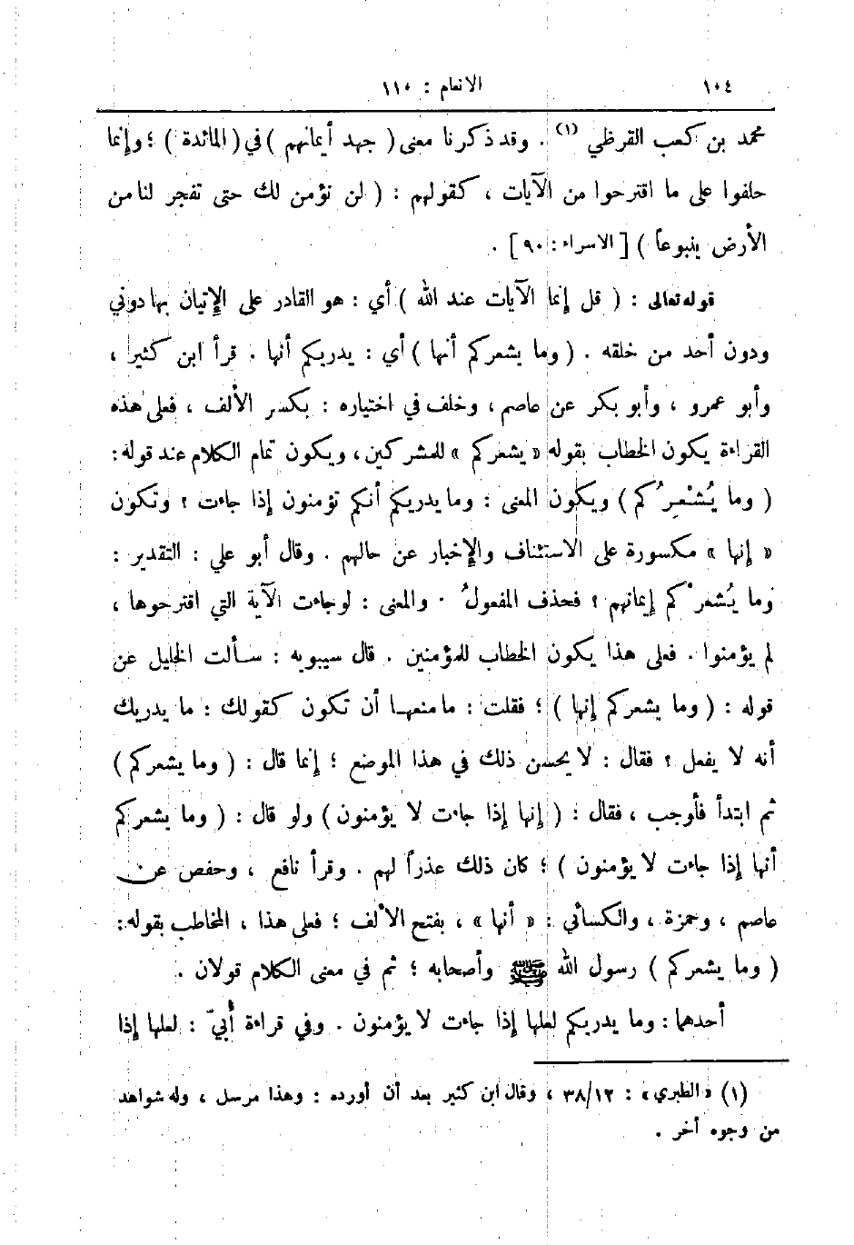 قوله تعالى قل إنما الآيات عند الله أي هو القادر على الإتيان بها دوني ودون أحد من خلقه وما يشعركم أنها أي يدريكم أنها قرأ ابن كثير وأبو عمرو وأبو بكر عن عاصم وخلف في اختياره بكسر الألف فعلى هذه القراءة يكون الخطاب بقوله يشعركم للمشركين ويكون تمام الكلام عند قوله وما يشعركم ويكون المعنى وما يدريكم أنكم تؤمنون إذا جاءت وتكون إنها مكسورة على الاستئناف والإخبار عن حالهم وقال أبو علي التقدير وما يشعركم إيمانهم فحذف المفعول والمعنى لو جاءت الآية التي اقترحوها لم يؤمنوا فعلى هذا يكون الخطاب للمؤمنين قال سيبويه سألت الخليل عن قوله وما يشعركم إنها فقلت ما منعها أن تكون كقولك ما يدريك أنه لا يفعل فقال لا يحسن ذلك في هذا الموضع إنما قال وما يشعركم ثم ابتدأ فأوجب فقال إنها إذا جاءت لا يؤمنون ولو قال وما يشعركم أنها إذا جاءت لا يؤمنون كان ذلك عذرا لهم وقرأ نافع وحفص عن عاصم وحمزة والكسائي أنها بفتح الألف فعلى هذا المخاطب بقوله وما يشعركم رسول الله صلى الله عليه و سلم وأصحابه ثم في معنى الكلام قولان
