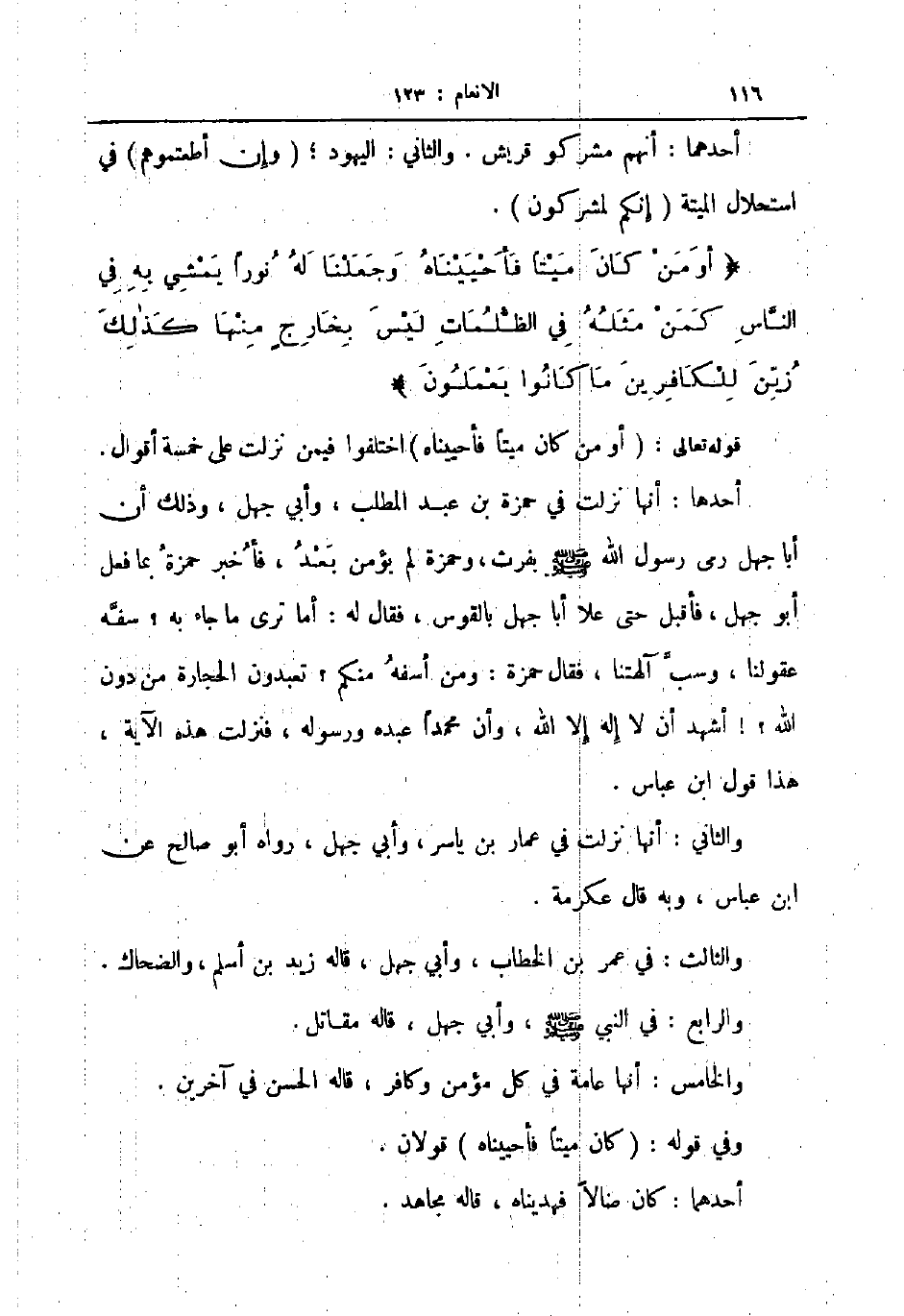 قوله تعالى أو من كان ميتا فأحييناه اختلفوا فيمن نزلت على خمسة اقوال