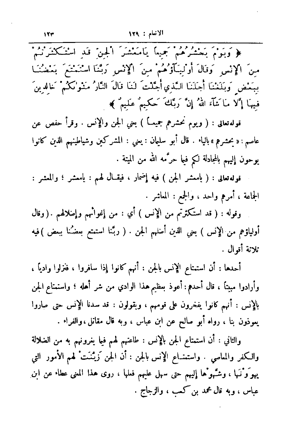 والثاني أن استمتاع الجن بالإنس طاعتهم لهم فيما يغرونهم به من الضلالة والكفر والمعاصي واستمتاع الإنس بالجن أن الجن زينت لهم الأمور التي يهوونها وشهوها إليهم حتى سهل عليهم فعلها روى هذا المعنى عطاء عن ابن عباس وبه قال محمد بن كعب والزجاج