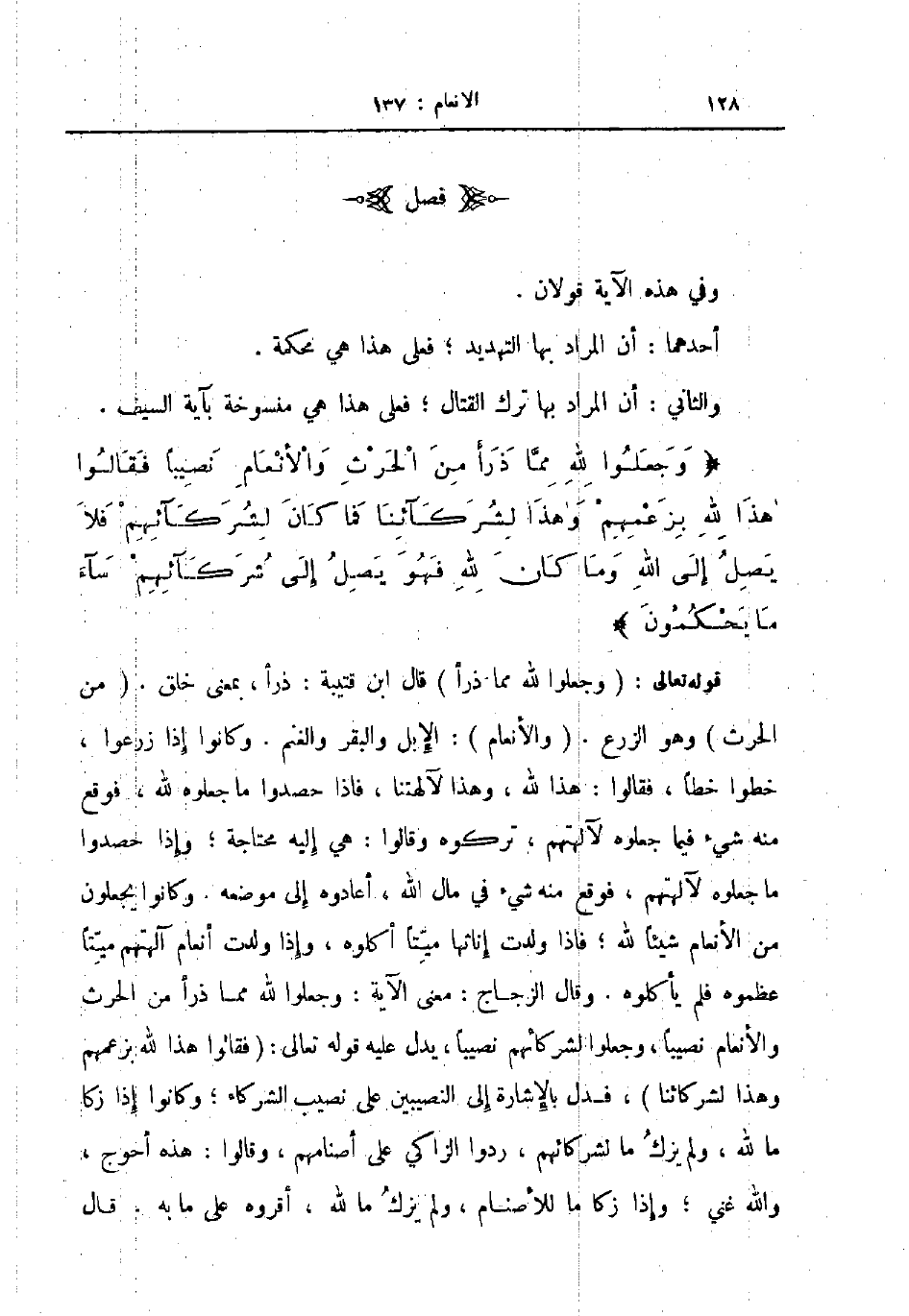 قوله تعالى وجعلوا لله مما ذرأ قال ابن قتيبة ذرأ بمعنى خلق من الحرث وهو الزرع والأنعام الإبل والبقر والغنم وكانوا إذا زرعوا خطوا خطا فقالوا هذا لله وهذا لآلهتنا فاذا حصدوا ما جعلوه لله فوقع منه شيء فيما جعلوه لآلهتهم تركوه وقالوا هي إليه محتاجة وإذا حصدوا ما جعلوه لآلهتهم فوقع منه شيء في مال الله أعادوه إلى موضعه وكانوا يجعلون من الأنعام شيئا لله فاذا ولدت إناثها ميتا أكلوه وإذا ولدت أنعام آلهتهم ميتا عظموه فلم يأكلوه وقال الزجاج معنى الآية وجعلوا لله مما ذرأ من الحرث والانعام نصيبا وجعلوا لشركائهم نصيبا يدل عليه قوله تعالى فقالوا هذا لله بزعمهم وهذا لشركائنا فدل بالإشارة إلى النصيبين على نصيب الشركاء وكانوا إذا زكا ما لله ولم يزك ما لشركائهم ردوا الزاكي على أصنامهم وقالوا هذه أحوج والله غني وإذا زكا ما للأصنام ولم يزك ما لله أقروه على ما به قال