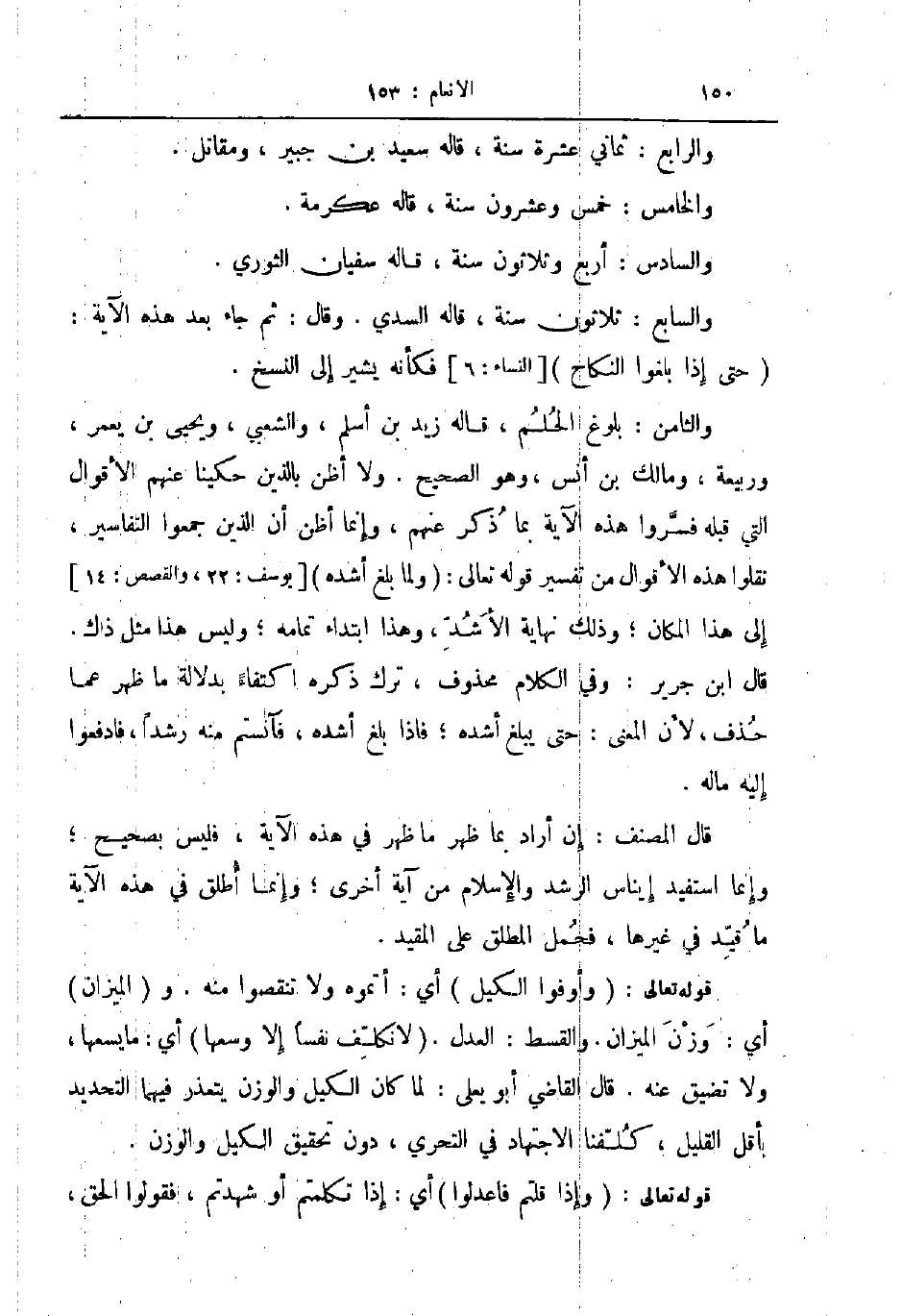 والثامن بلوغ الحلم قاله زيد بن أسلم والشعبي ويحيى بن يعمر وربيعة ومالك بن أنس وهو الصحيح ولا أظن بالذين حكينا عنهم الأقوال التي قبله فسروا هذه الآية بما ذكر عنهم وإنما أظن أن الذين جمعوا التفاسير نقلوا هذه الأقوال من تفسير قوله تعالى ولما بلغ أشده إلى هذا المكان وذلك نهاية الأشد وهذا ابتداء تمامه وليس هذا مثل ذاك قال ابن جرير وفي الكلام محذوف ترك ذكره اكتفاء بدلالة ما ظهر عما حذف لأن المعنى حتى يبلغ أشده فإذا بلغ اشده فآنستم منه رشدا فادفعوا إليه ماله