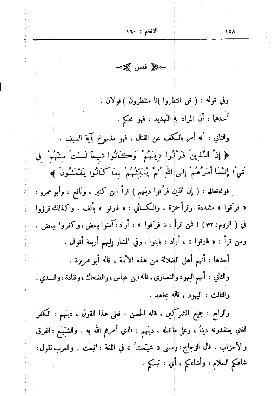 قوله تعالى إن الذين فرقوا دينهم قرأ ابن كثير ونافع وأبو عمرو فرقوا مشددة وقرأ حمزة والكسائي فارقوا بألف وكذلك قرؤوا في الروم فمن قرأ فرقوا أراد آمنوا ببعض وكفروا ببعض ومن قرأ فارقوا أراد باينوا وفي المشار إليهم أربعة أقوال