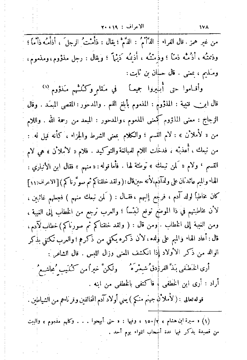 قال ابن قتيبة المذؤوم المذموم بأبلغ الذم والمدحور المقصى المبعد وقال الزجاج معنى المذؤوم كمعنى المذموم والمدحور المبعد من رحمة الله واللام من لأملأن لام القسم والكلام بمعنى الشرط والجزاء كأنه قيل له من تبعك أعذبه فدخلت اللام للمبالغة والتوكيد فلام لأملأن هي لام القسم ولام لمن تبعك توطئة لها فأما قوله منهم فقال ابن الانباري الهاء والميم عائدتان على ولد آدم لانه حين قال ولقد خلقناكم ثم صورناكم كان مخاطبا لولد آدم فرجع إليهم فقال لمن تبعك منهم فجعلهم غائبين لأن مخاطبتهم في ذا الموضع توقع لبسا والعرب ترجع من الخطاب إلى الغيبة ومن الغيبة إلى الخطاب ومن قال ولقد خلقناكم ثم صورناكم خطاب لآدم قال أعاد الهاء والميم على ولده لأن ذكره يكفي من ذكرهم والعرب تكتفي بذكر الوالد من ذكر الأولاد إذا انكشف المعنى وزال اللبس قال الشاعر ... ارى الخطفى بذ الفرزدق شعره ... ولكن خيرا من كليب مجاشع ...