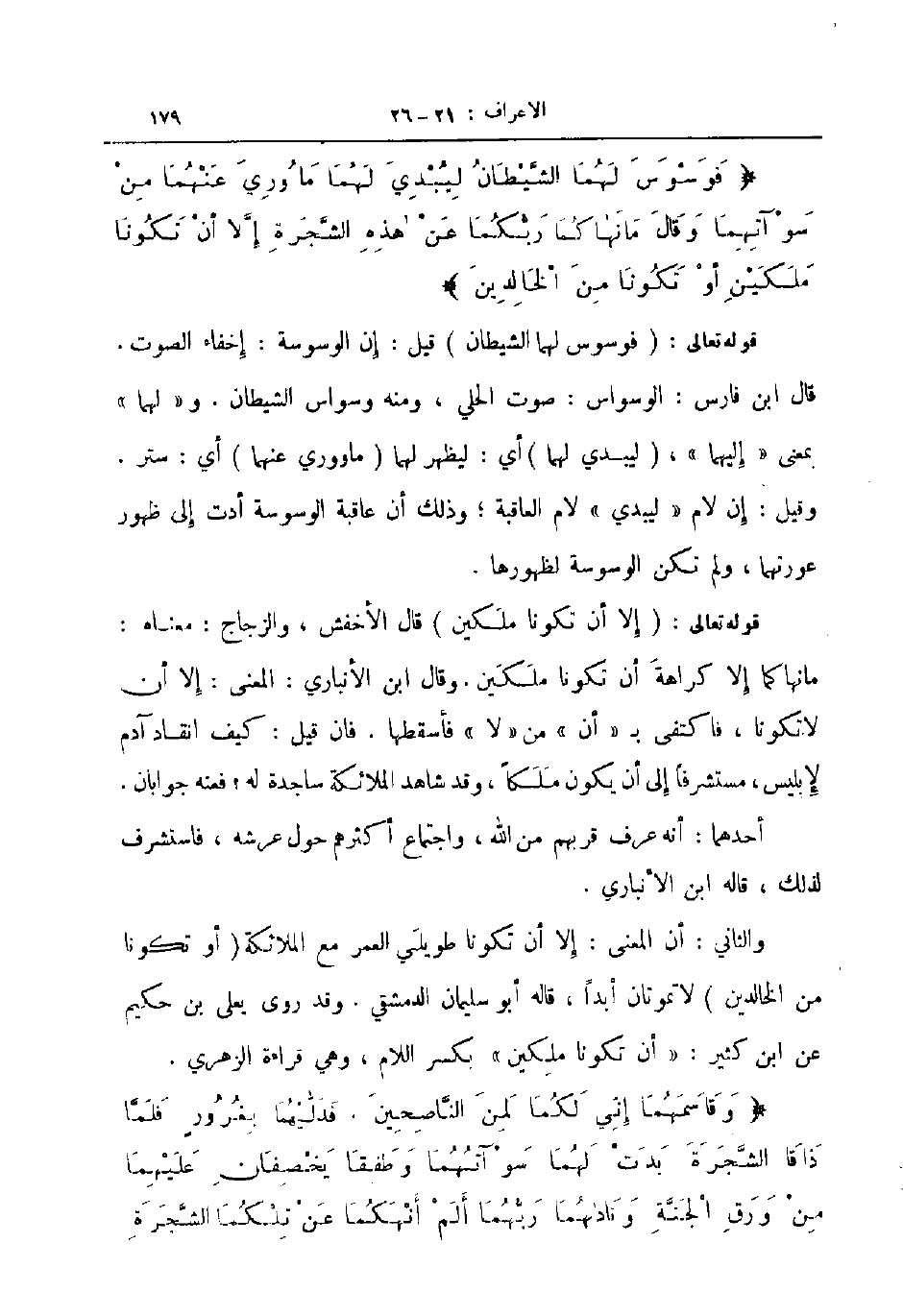 قوله تعالى فوسوس لهما الشيطان قيل إن الوسوسة إخفاء الصوت قال ابن فارس الوسواس صوت الحلي ومنه وسواس الشيطان ولهما بمعنى إليهما ليبدي لهما أي ليظهر لهما ماووري عنهما أي ستر وقيل إن لام ليبدي لام العاقبة وذلك أن عاقبة الوسوسة أدت إلى ظهور عورتهما ولم تكن الوسوسة لظهورها
