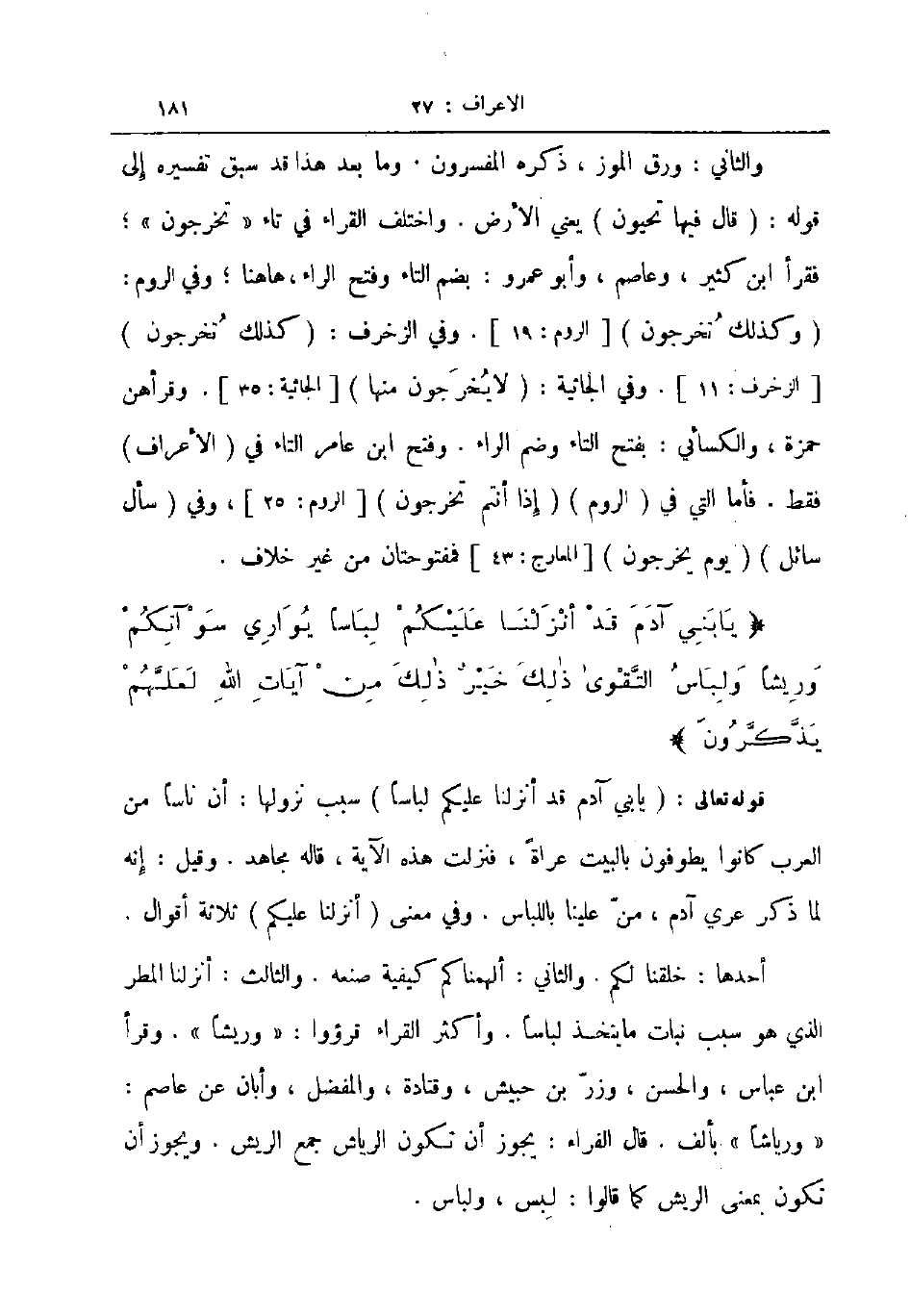 والثاني ورق الموز ذكره المفسرون وما بعد هذا قد سبق تفسيره إلى قوله قال فيها تحيون يعني الأرض واختلف القراء في تاء تخرجون فقرأ ابن كثير وعاصم وأبو عمرو بضم التاء وفتح الراء هاهنا وفي الروم وكذلك تخرجون وفي الزخرف كذلك تخرجون وفي الجاثية لا يخرجون منها وقرأهن حمزة والكسائي بفتح التاء وضم الراء وفتح ابن عامر التاء في الاعراف فقط فأما التي في الروم إذا أنتم تخرجون وفي سأل سائل يوم يخرجون فمفتوحتان من غير خلاف